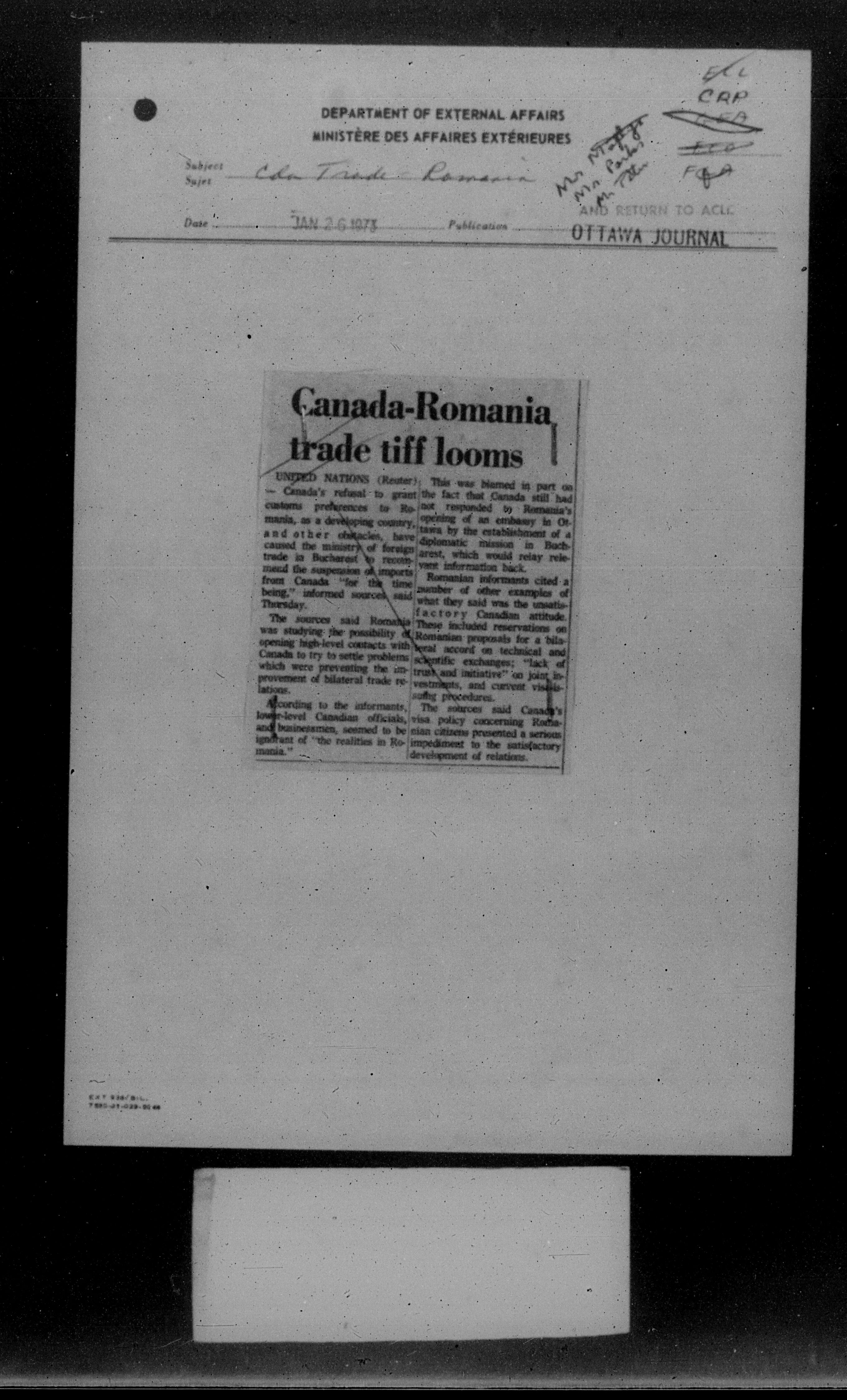 Department of External Affairs Library : newspaper clippings and manuals - 7792
