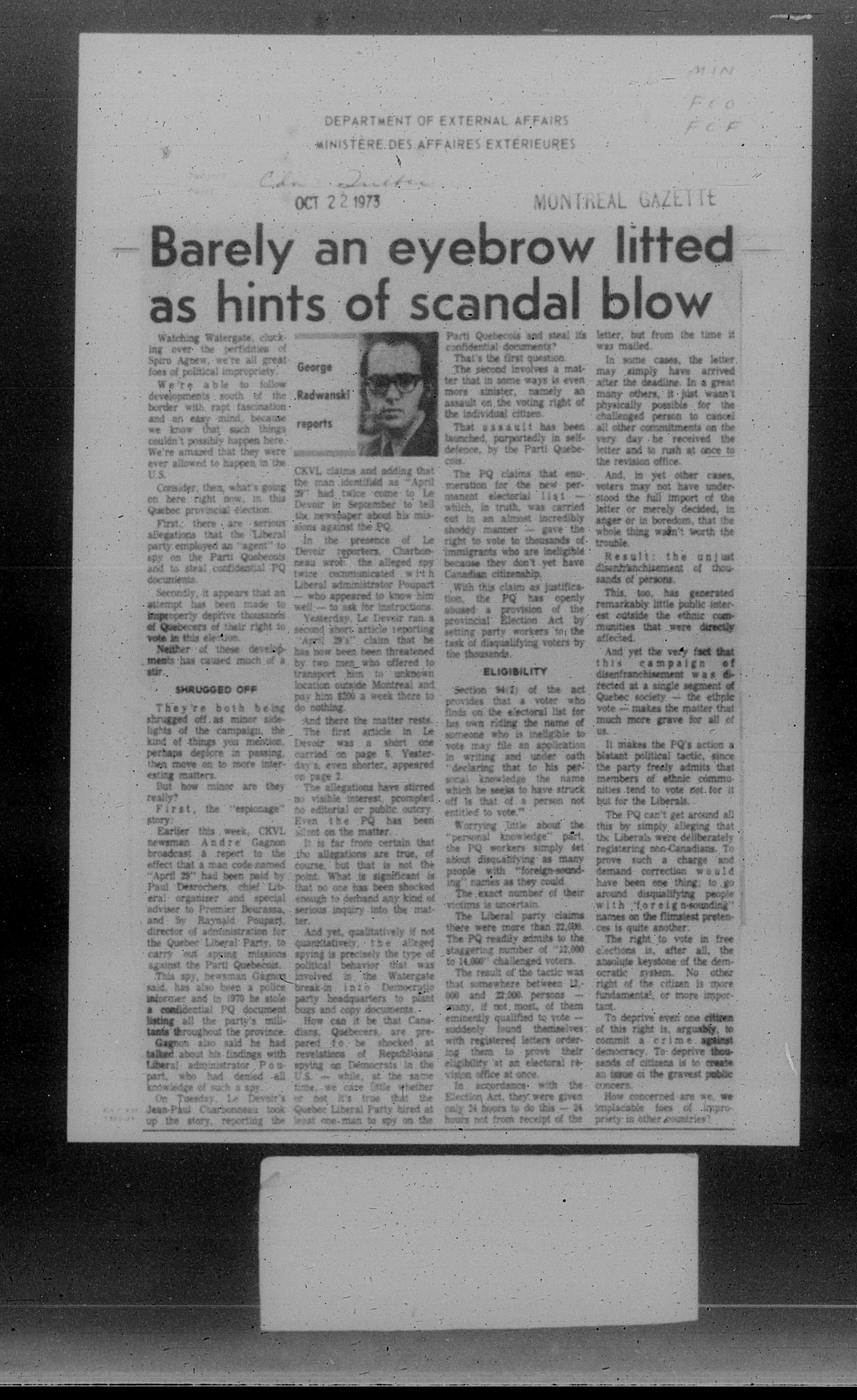 Department of External Affairs Library : newspaper clippings and manuals - 7792