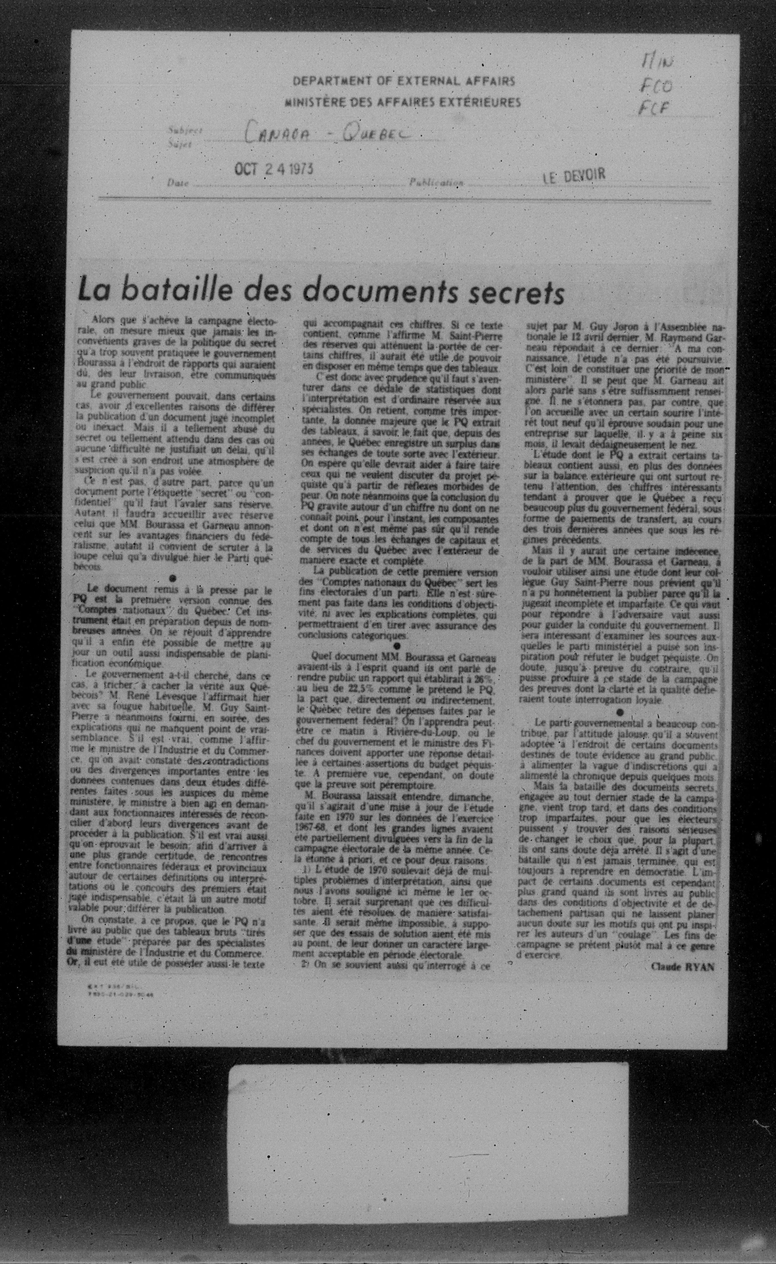 Department of External Affairs Library : newspaper clippings and manuals : C-7792