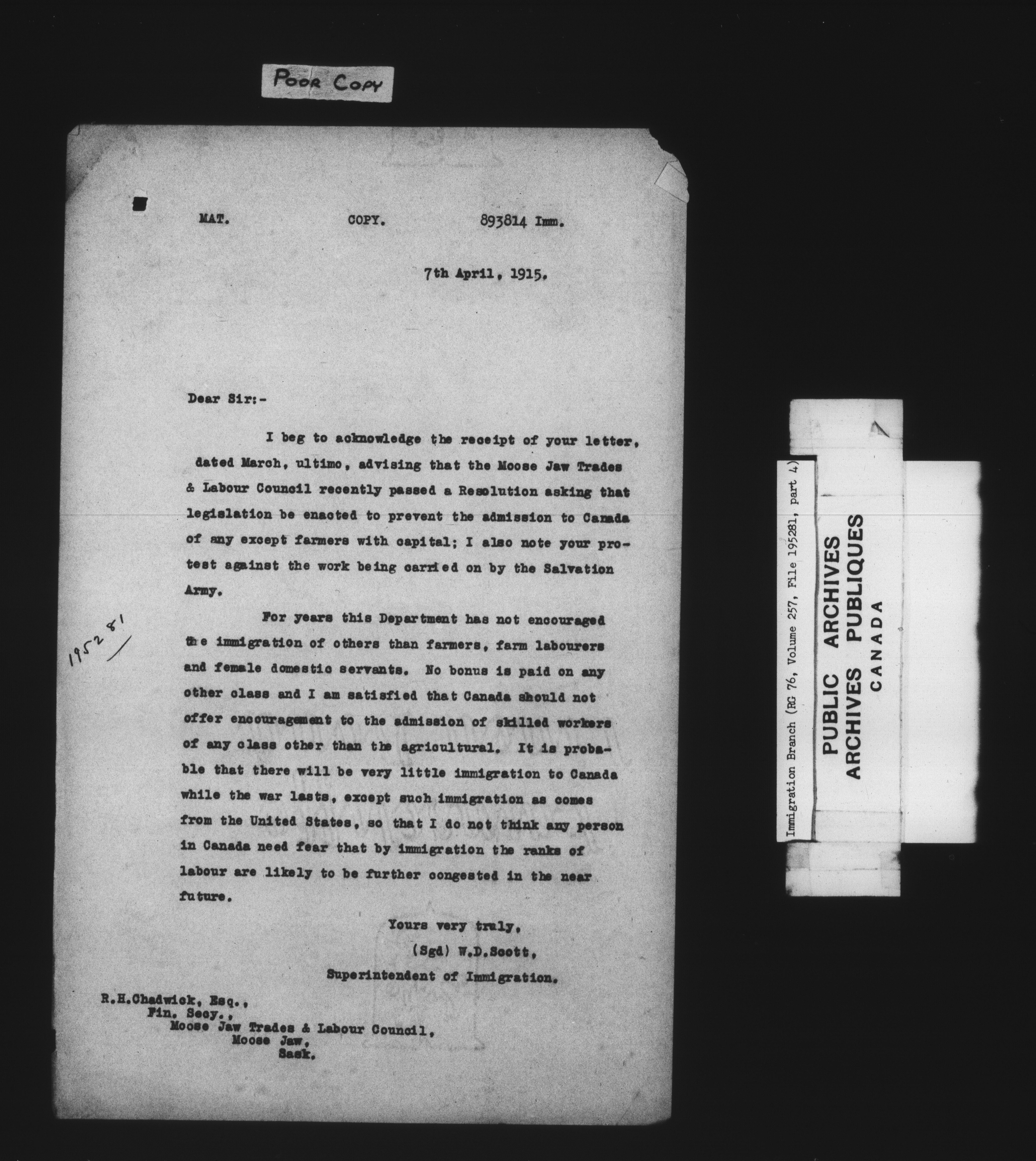 Subject, policy and case files in the First Central Registry series of the Immigration Program, 1892-1950 - 7805