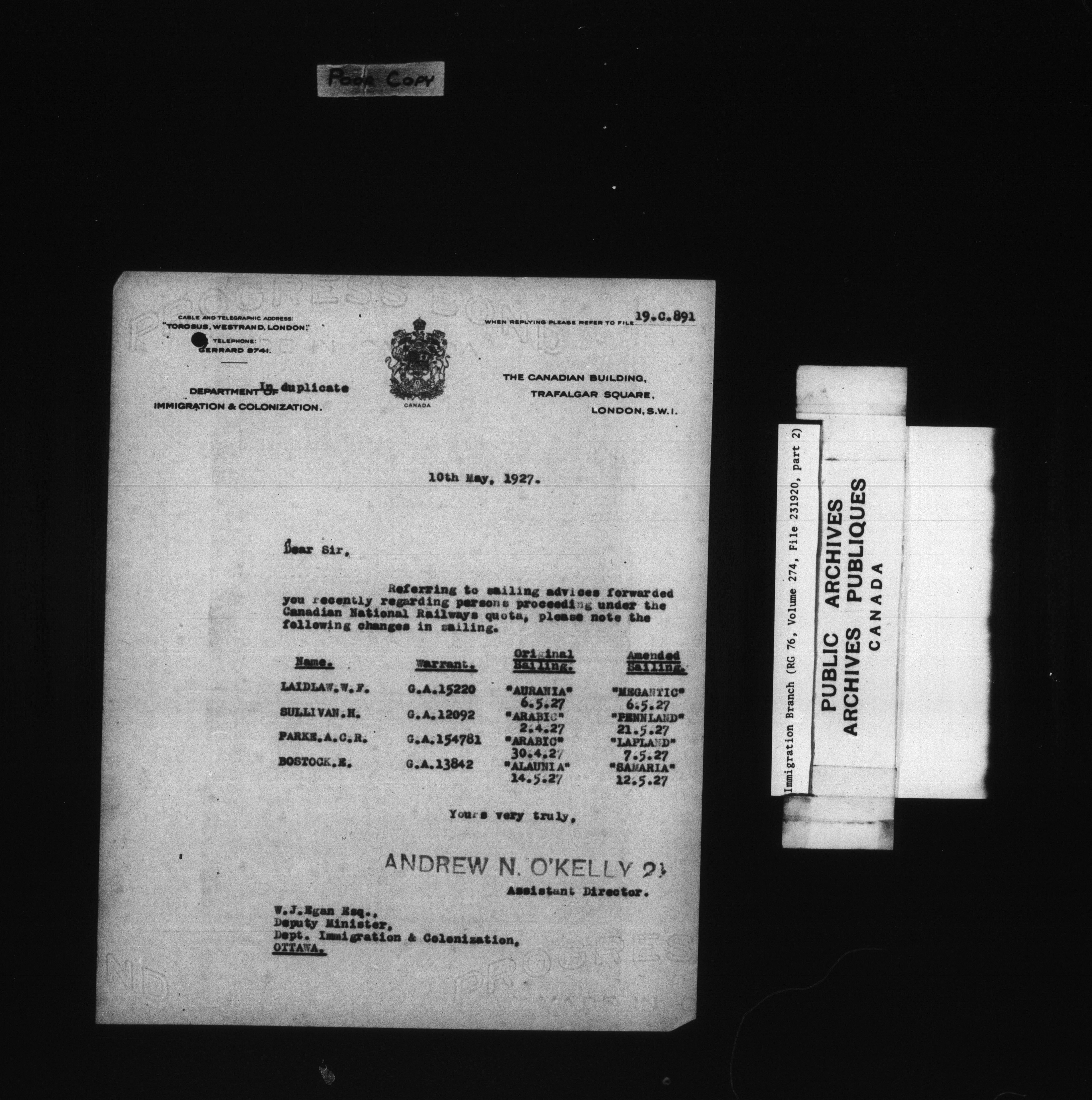 Subject, policy and case files in the First Central Registry series of the Immigration Program, 1892-1950 - 7822