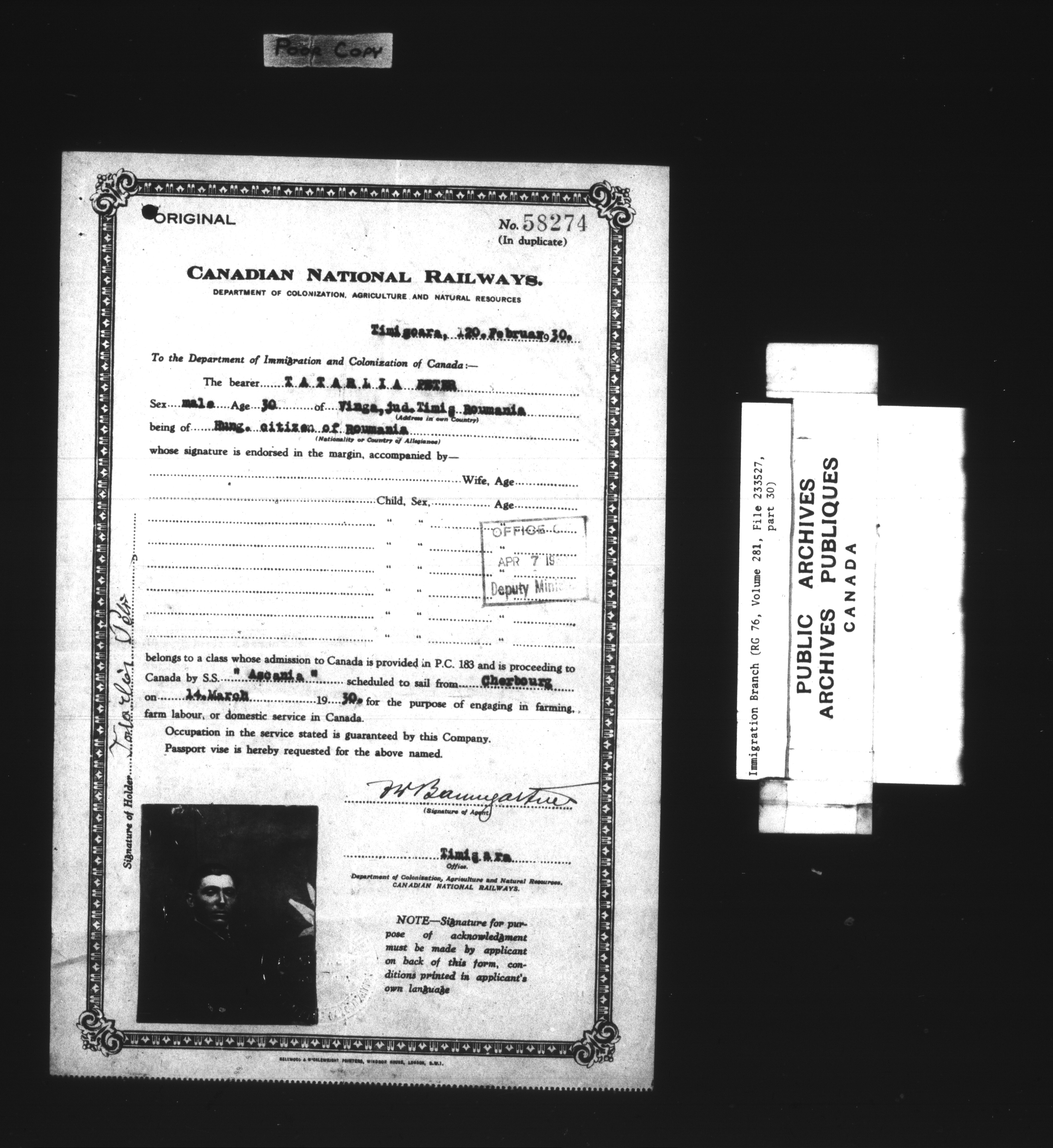 Subject, policy and case files in the First Central Registry series of the Immigration Program, 1892-1950 - 7829