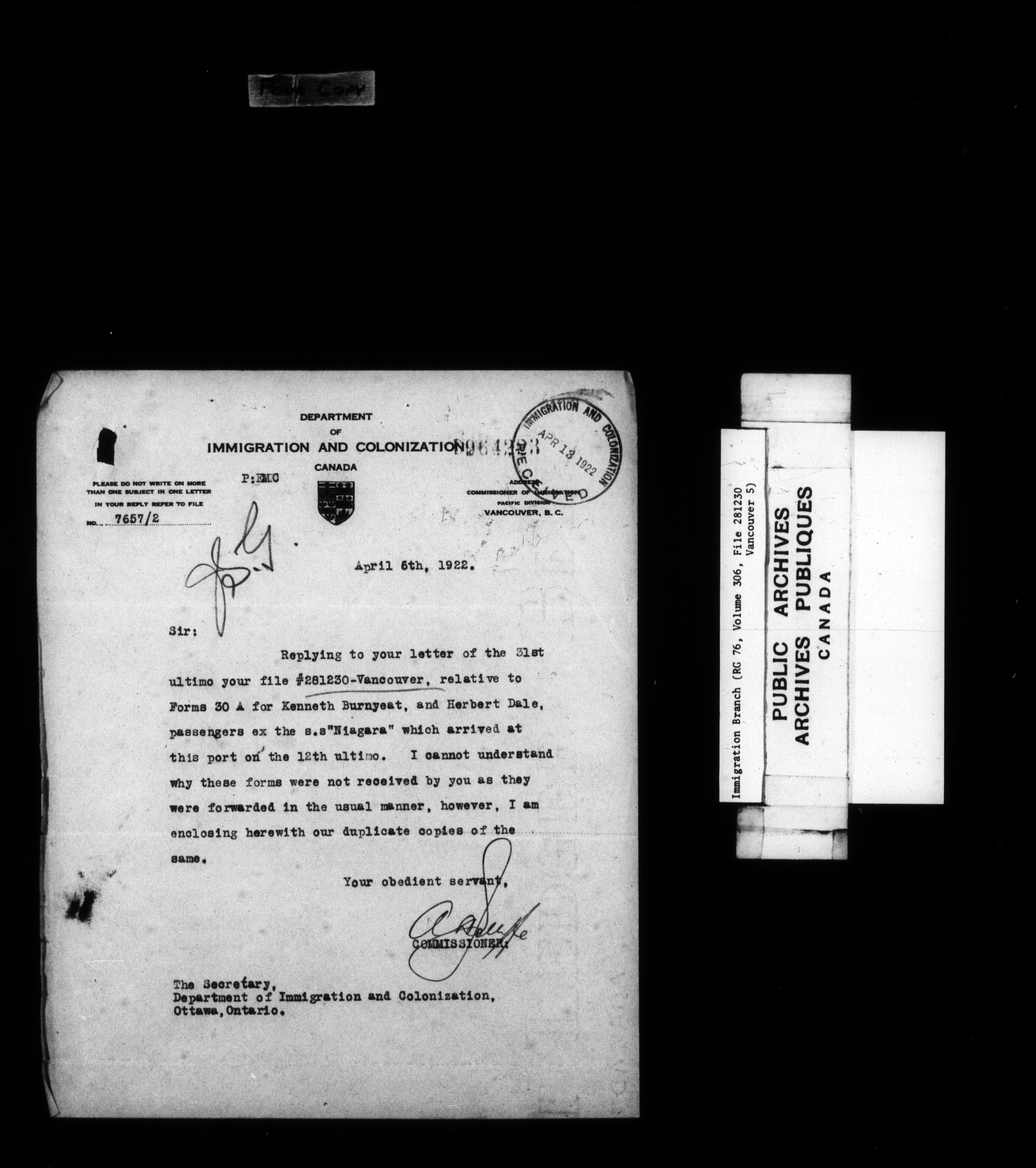 Subject, policy and case files in the First Central Registry series of the Immigration Program, 1892-1950 - 7857