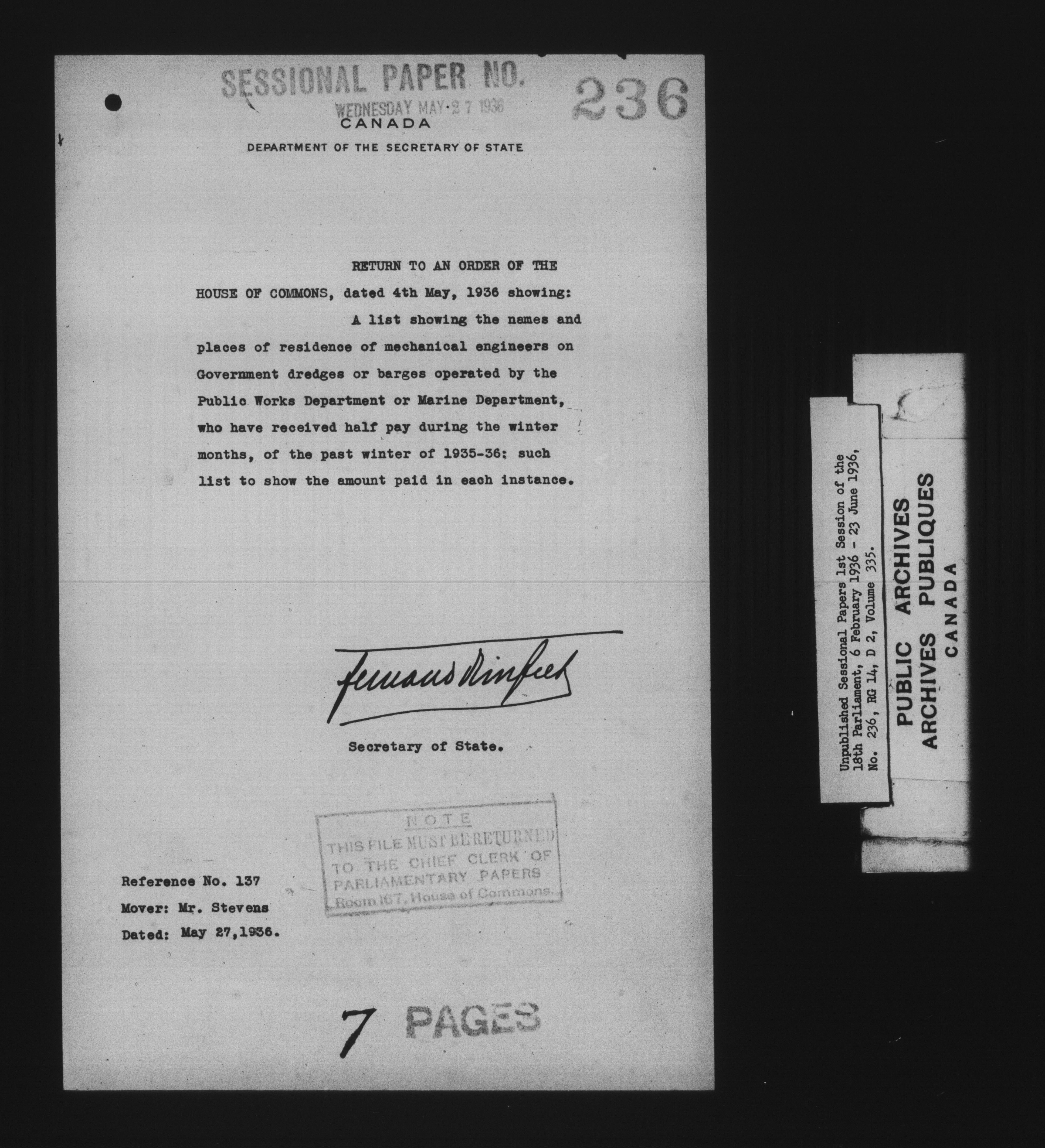 Unpublished sessional papers, 1st Session, 18th Parliament - 7874