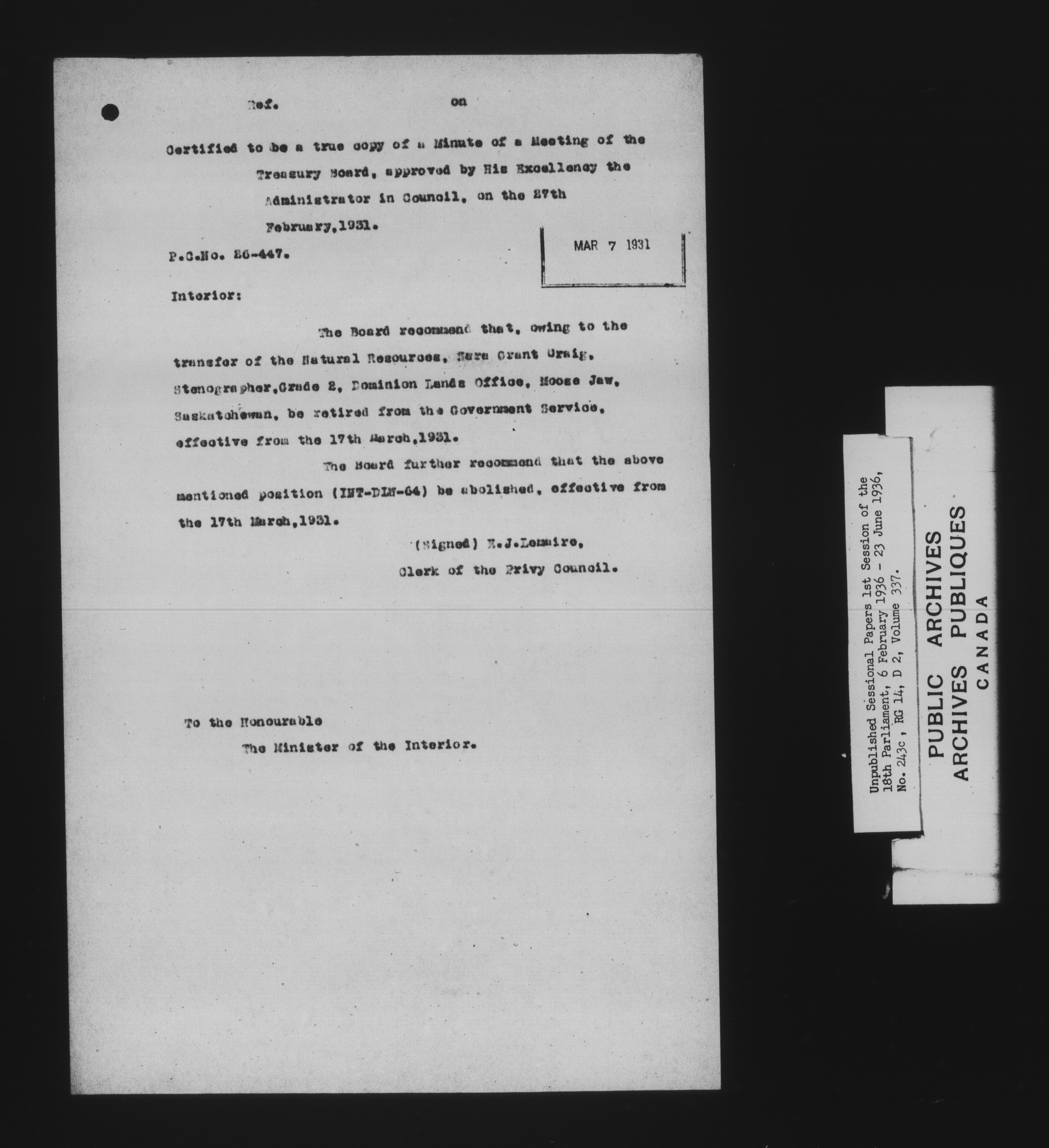 Unpublished sessional papers, 1st Session, 18th Parliament - 7875