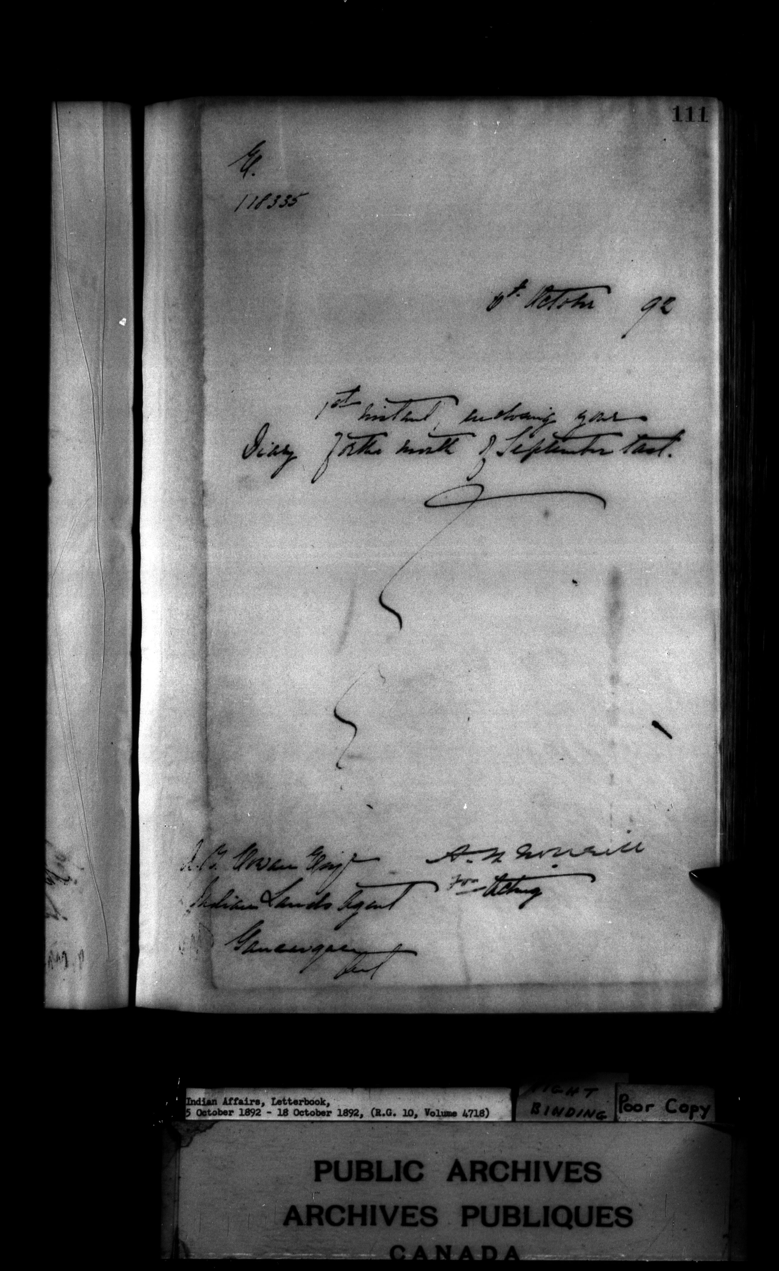 Indian Affairs, Letterbook, 5 October 1892 - 18 October 1892