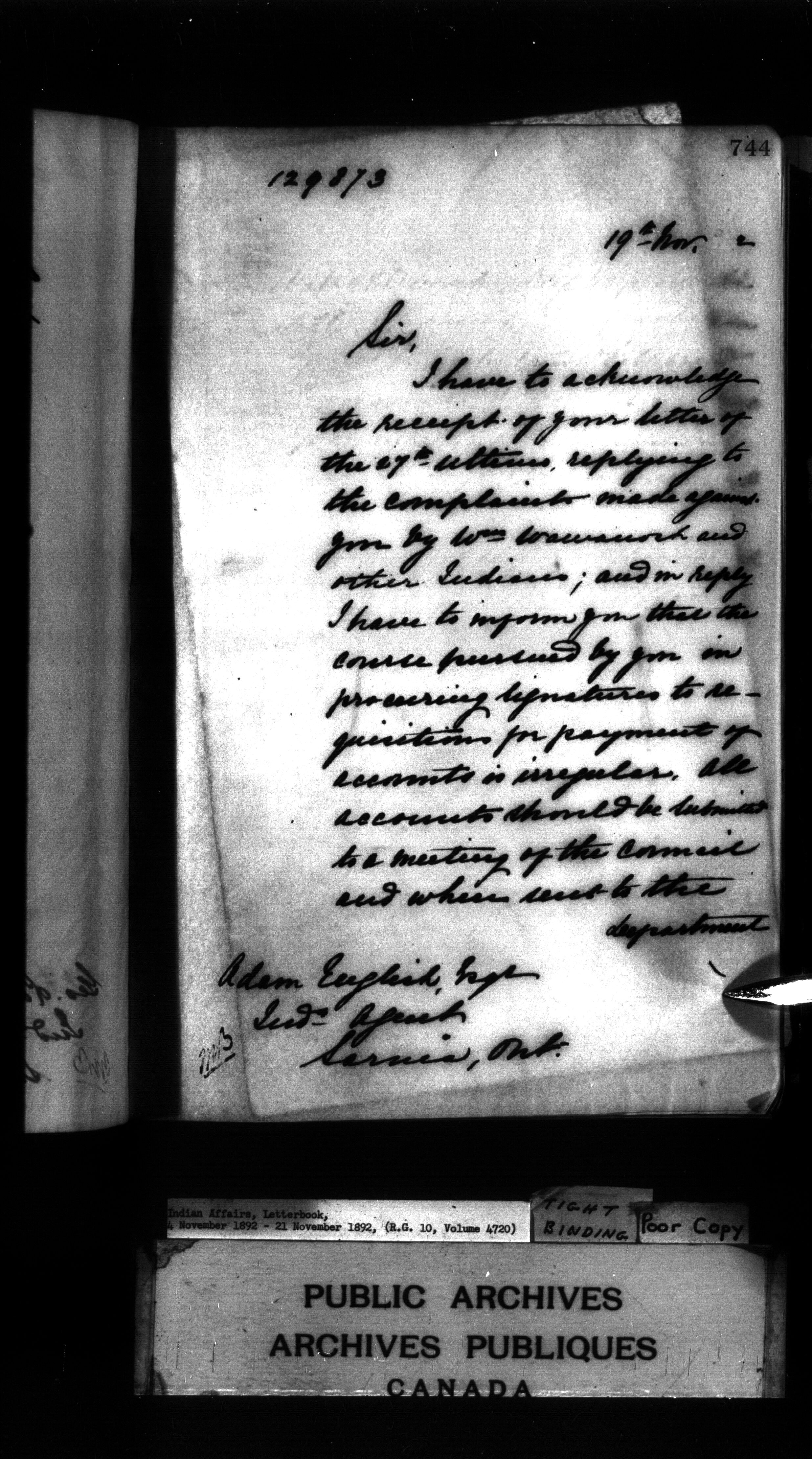 Indian Affairs, Letterbook, 4 November 1892 - 21 November 1892