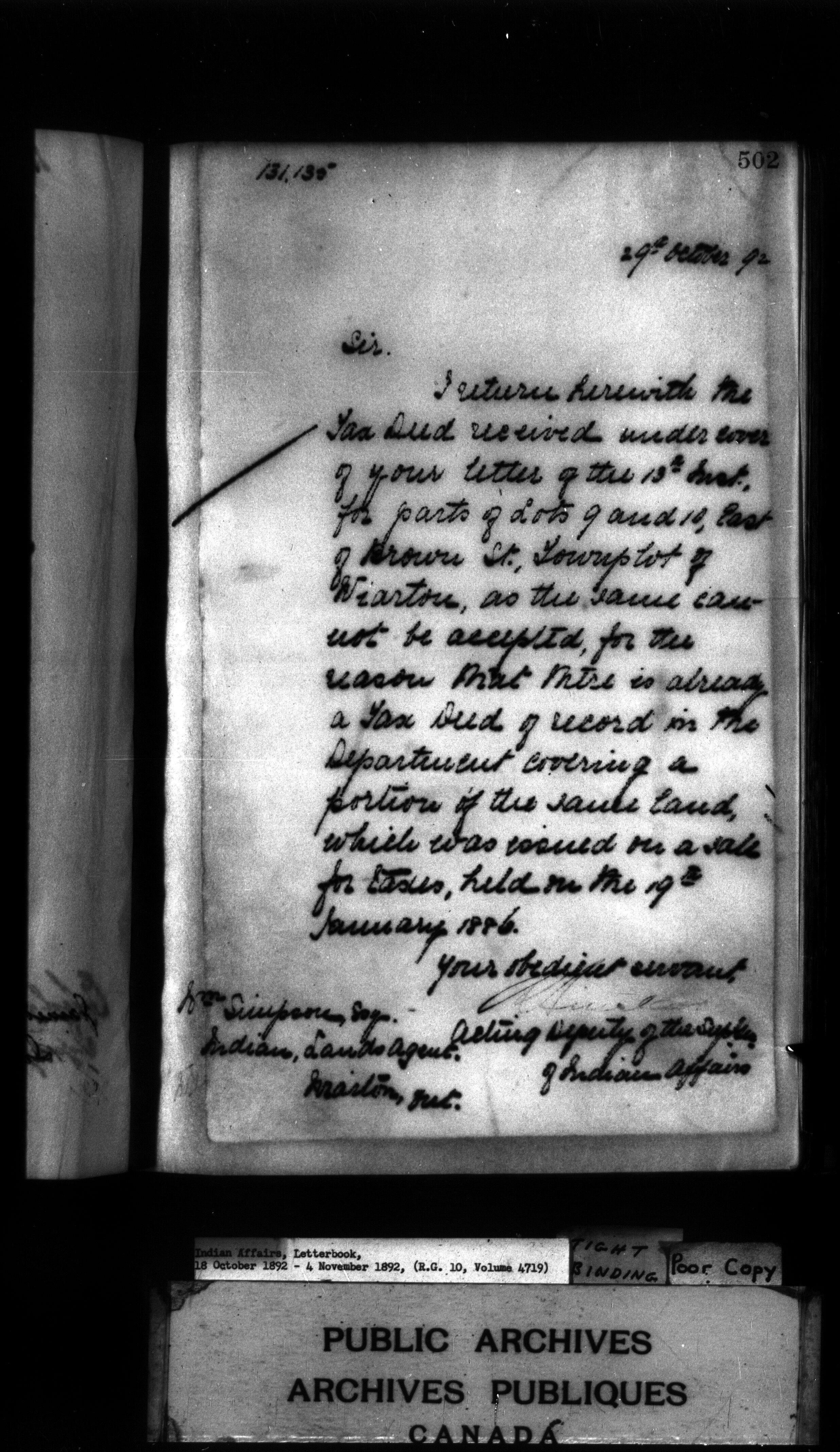 Indian Affairs, Letterbook, 18 October 1892 - 4 November 1892