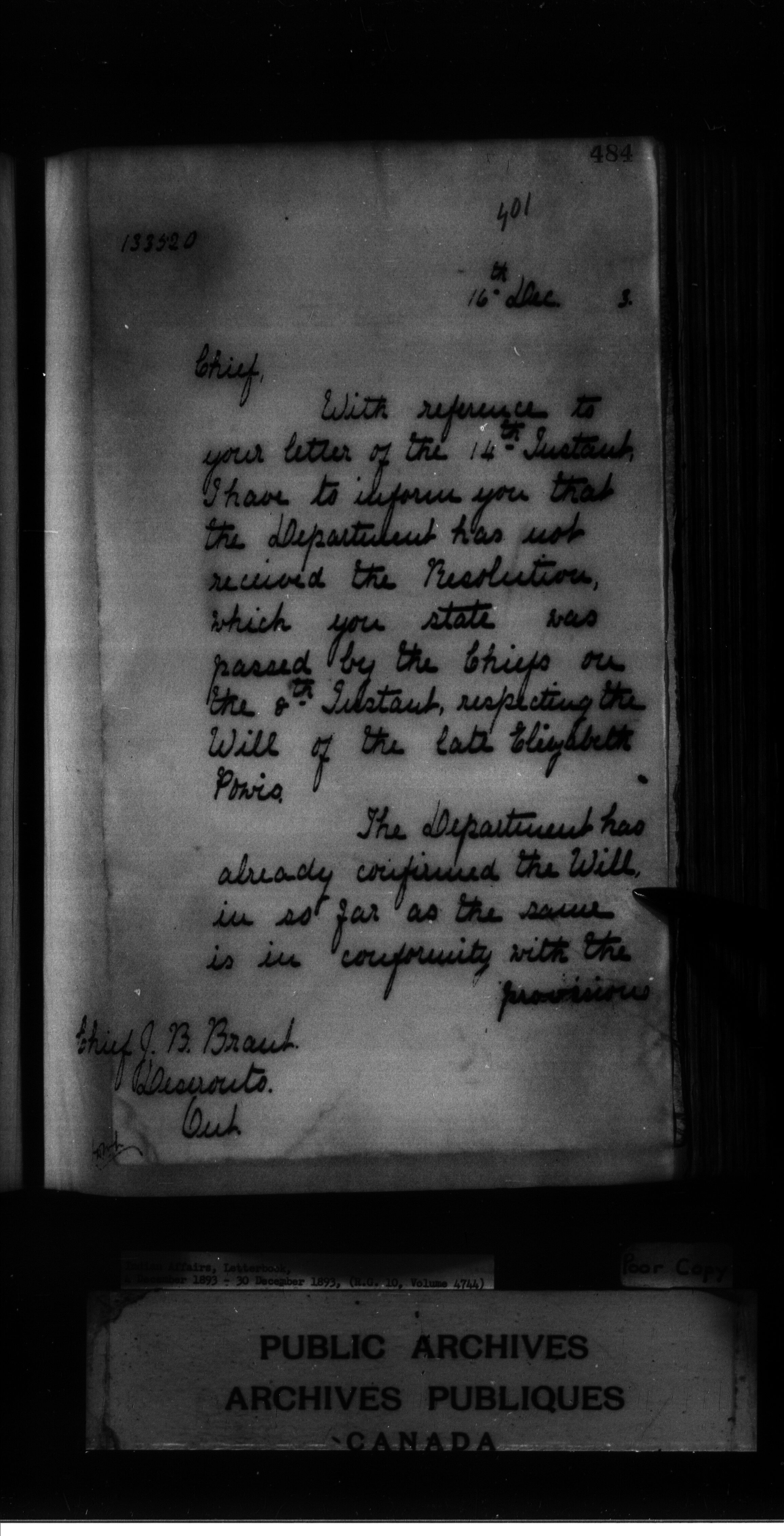 Indian Affairs, Letterbook, 4 December 1893 - 30 December 1893