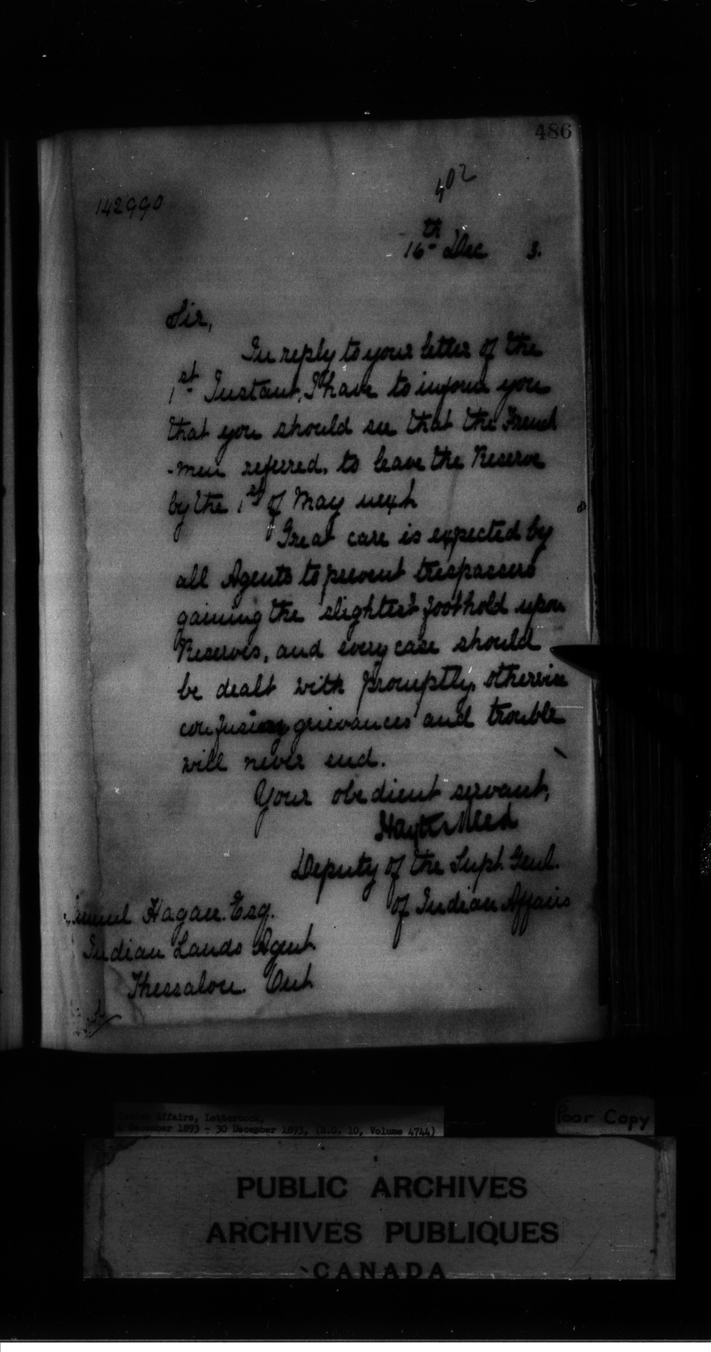 Indian Affairs, Letterbook, 4 December 1893 - 30 December 1893
