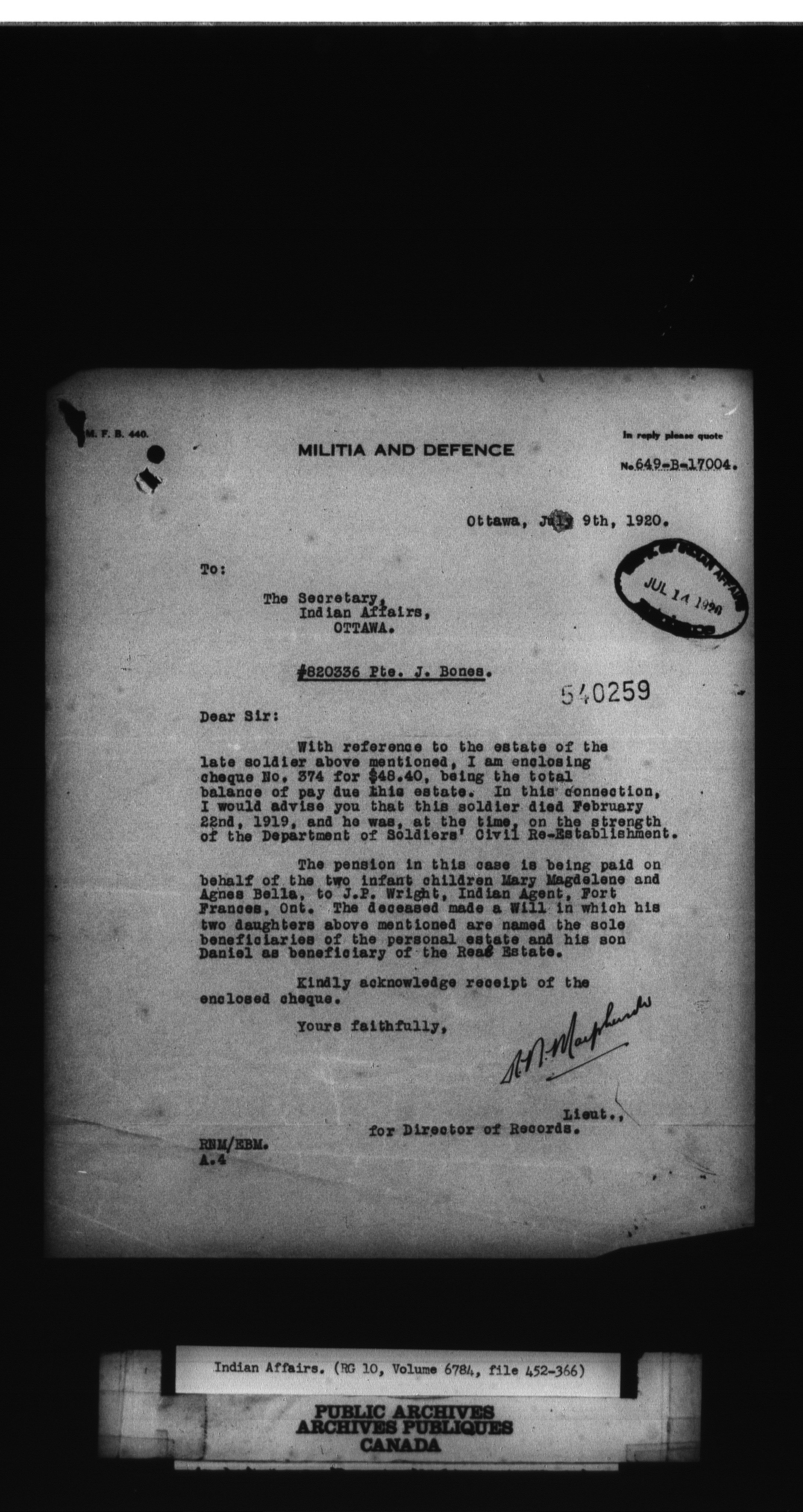 Department of Indian Affairs, Headquarters central registry system : First series; First Nations Soldiers
