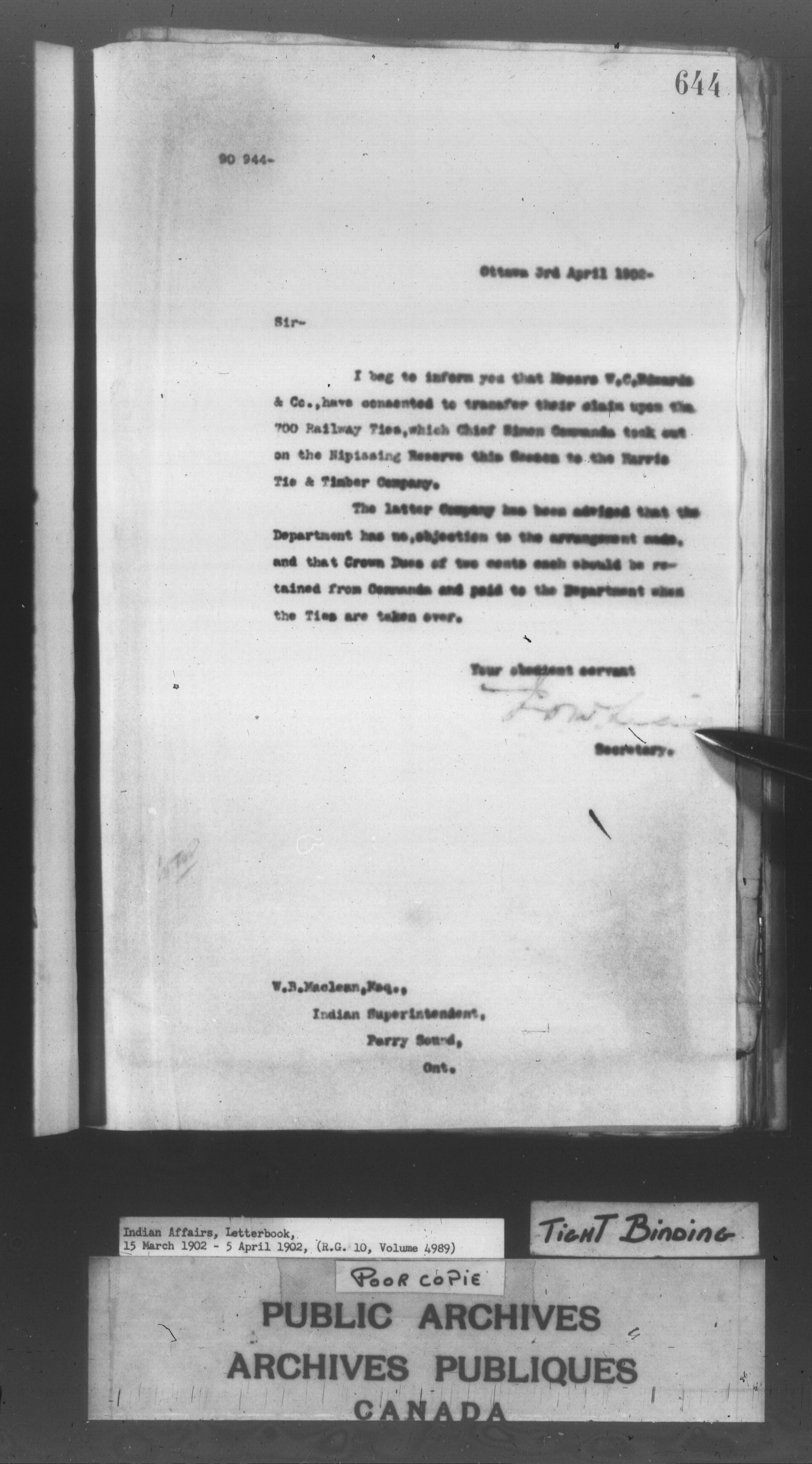 Department of Indian Affairs : Letterbooks of out-going correspondence relating to the administration of Indian Affairs in both eastern and western Canada, 1871-1920 - 8559