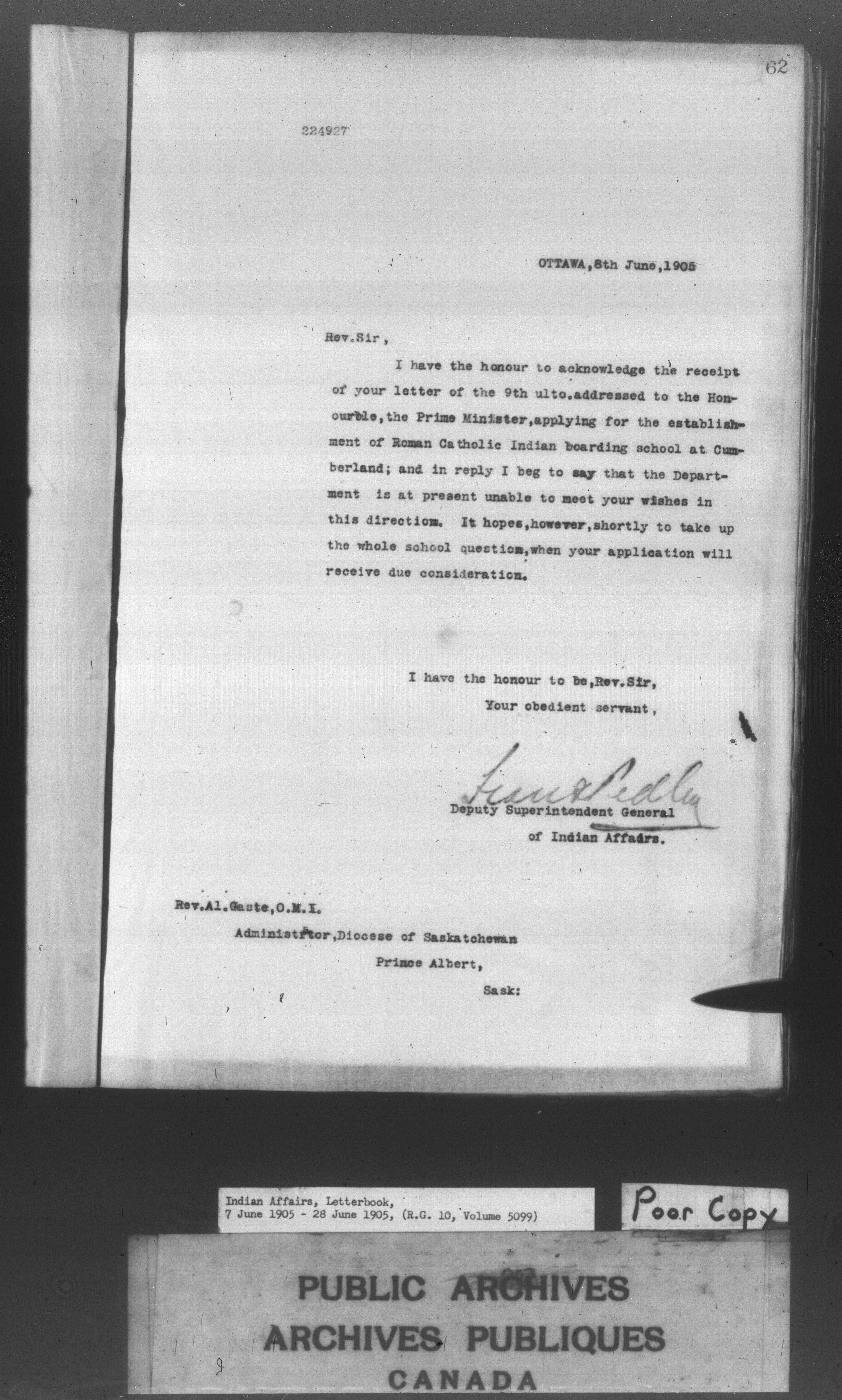 Department of Indian Affairs : Letterbooks of out-going correspondence relating to the administration of Indian Affairs in both eastern and western Canada, 1871-1920 - 8599