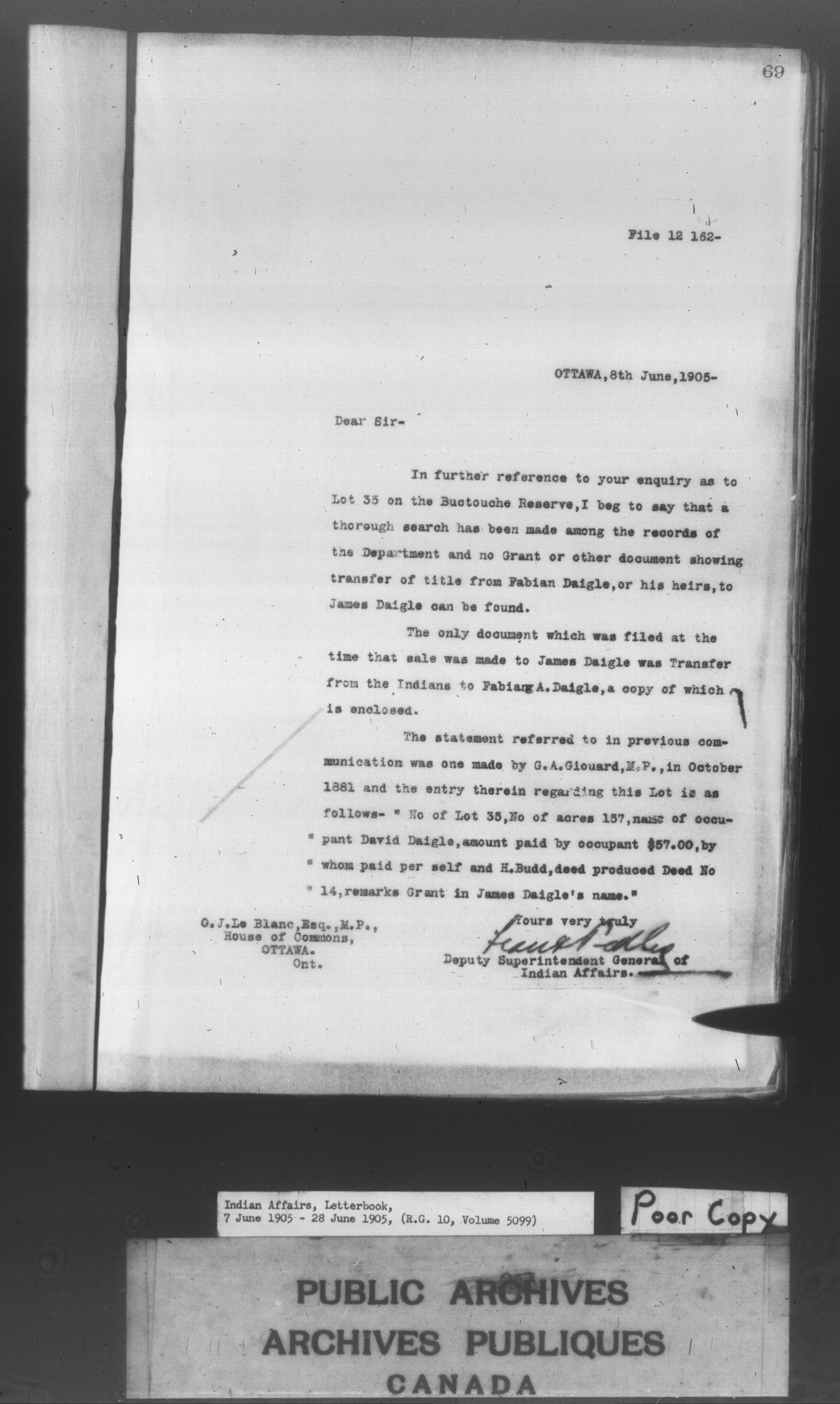 Department of Indian Affairs : Letterbooks of out-going correspondence relating to the administration of Indian Affairs in both eastern and western Canada, 1871-1920 - 8599