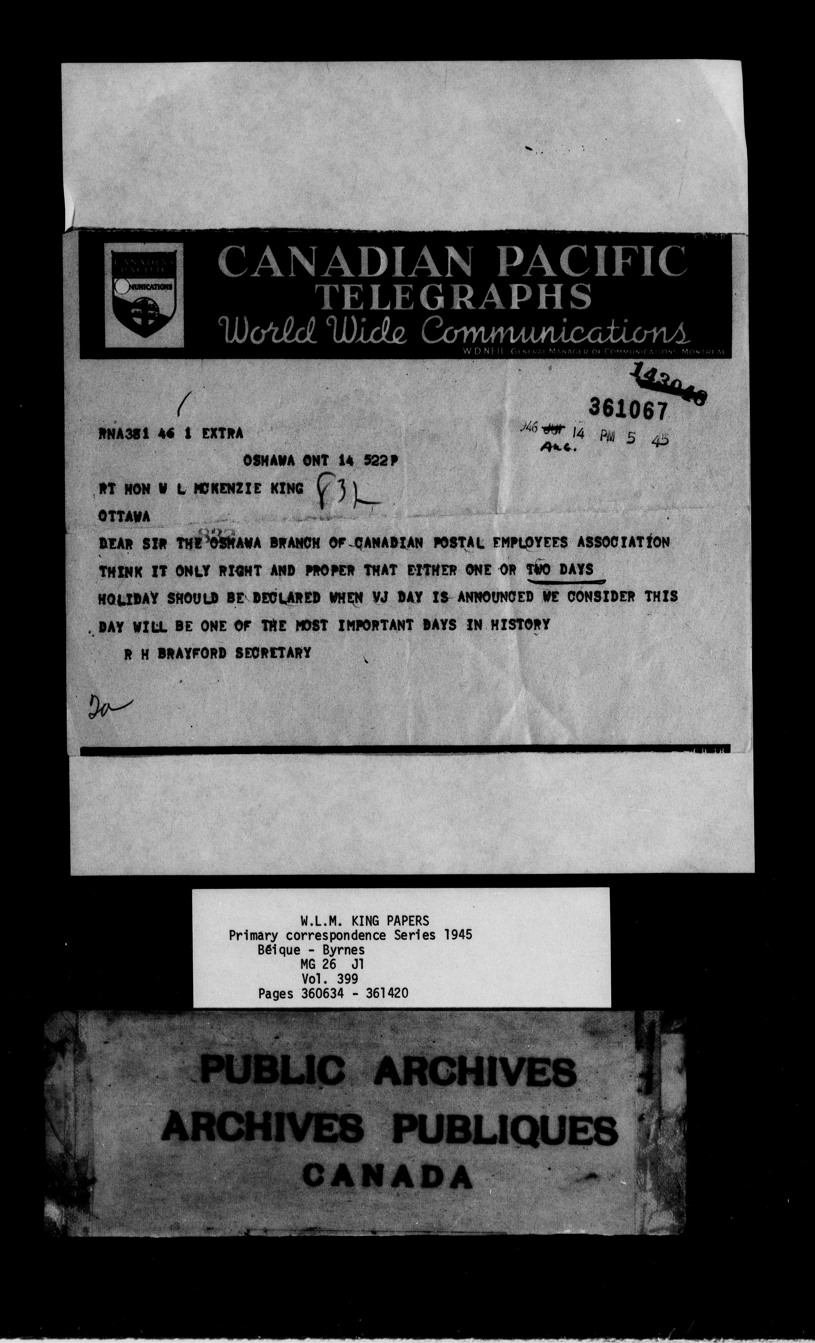 William Lyon Mackenzie King : Primary series correspondence (J1) - 9167
