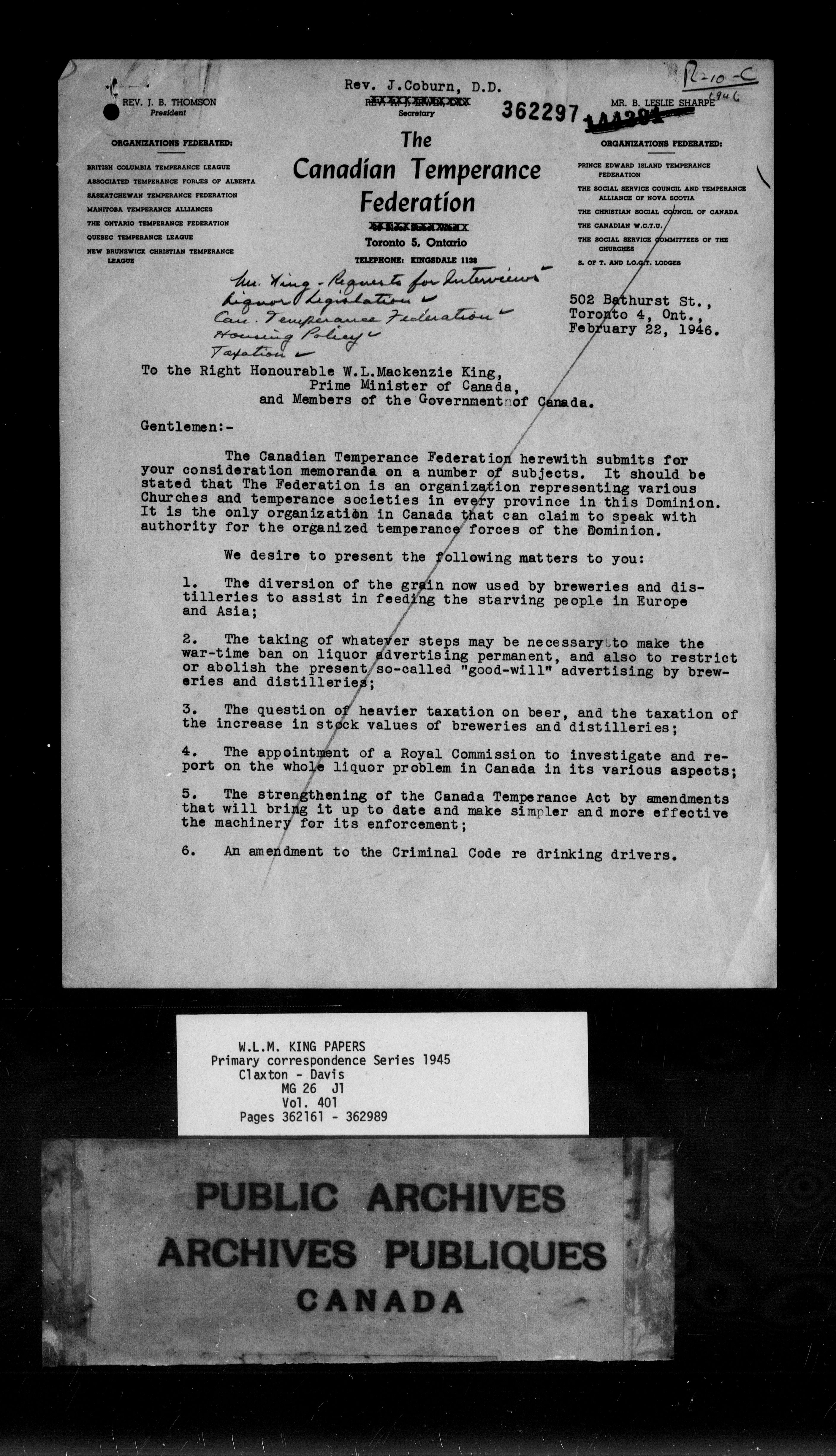 William Lyon Mackenzie King : Primary series correspondence (J1) - 9168