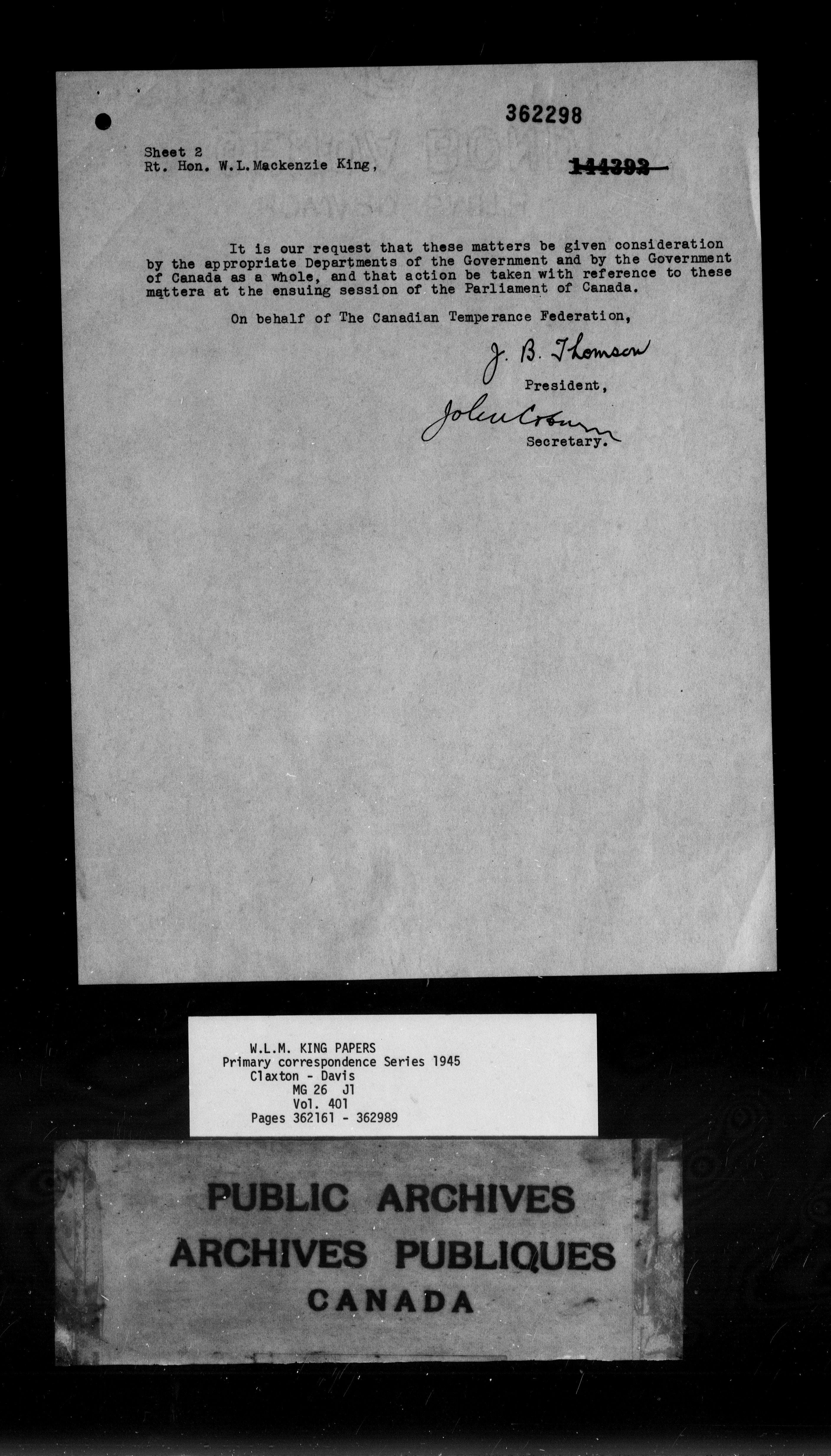 William Lyon Mackenzie King : Primary series correspondence (J1) - 9168