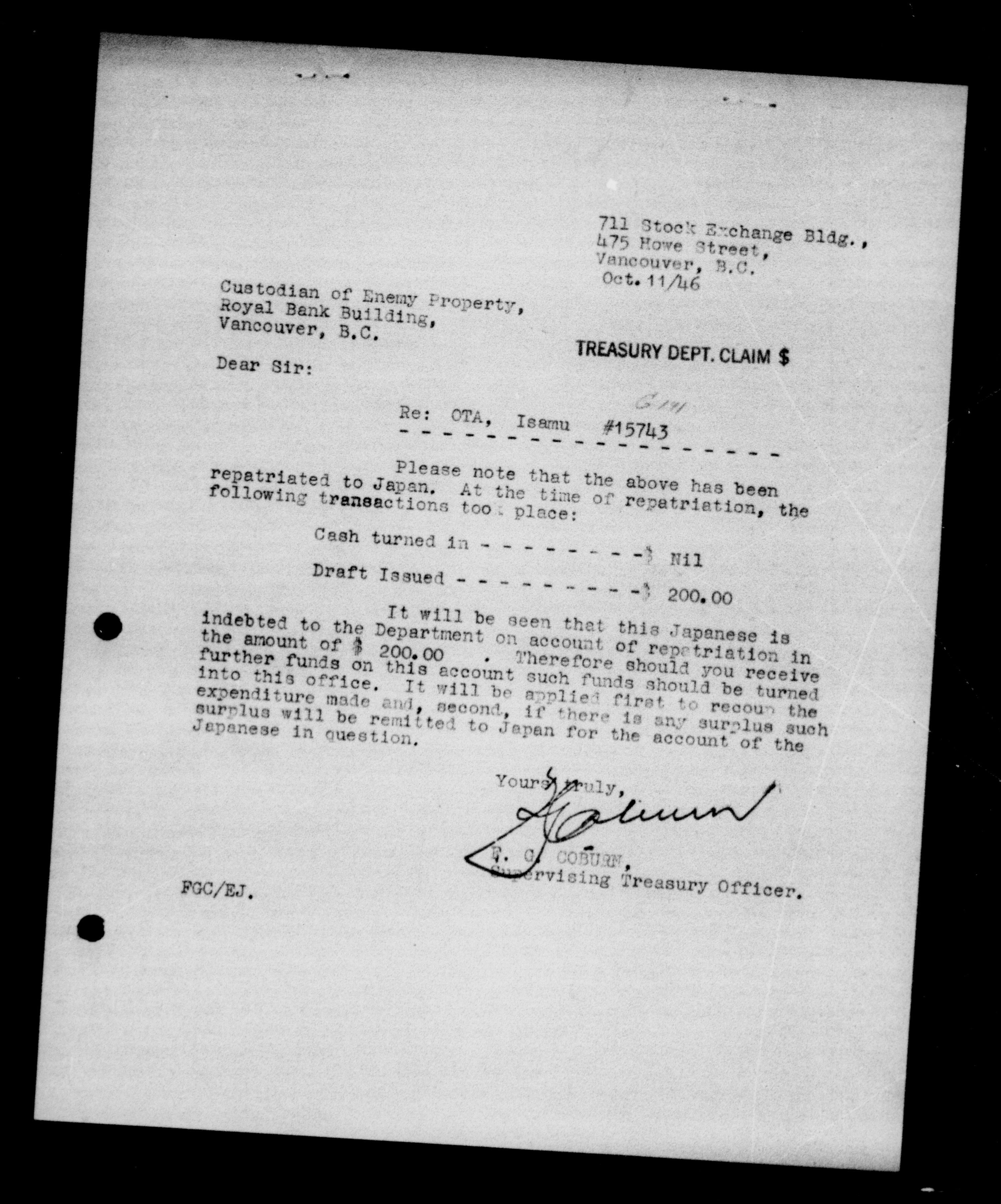 Office of the Custodian of Enemy Property, Vancouver Branch: Office files - 9472
