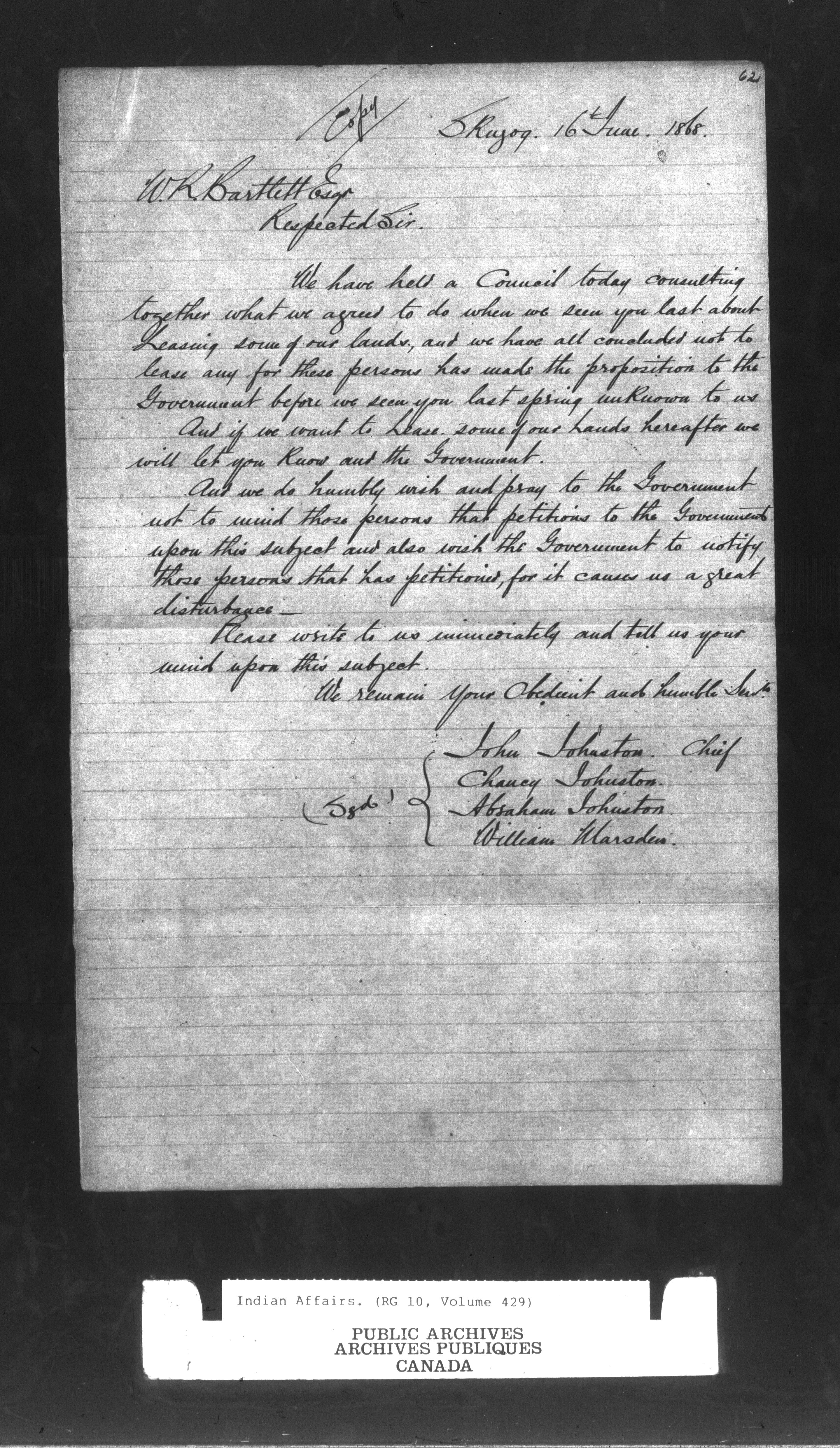 Department of Indian Affairs, Toronto office of the Central Superintendency : correspondence : C-9629