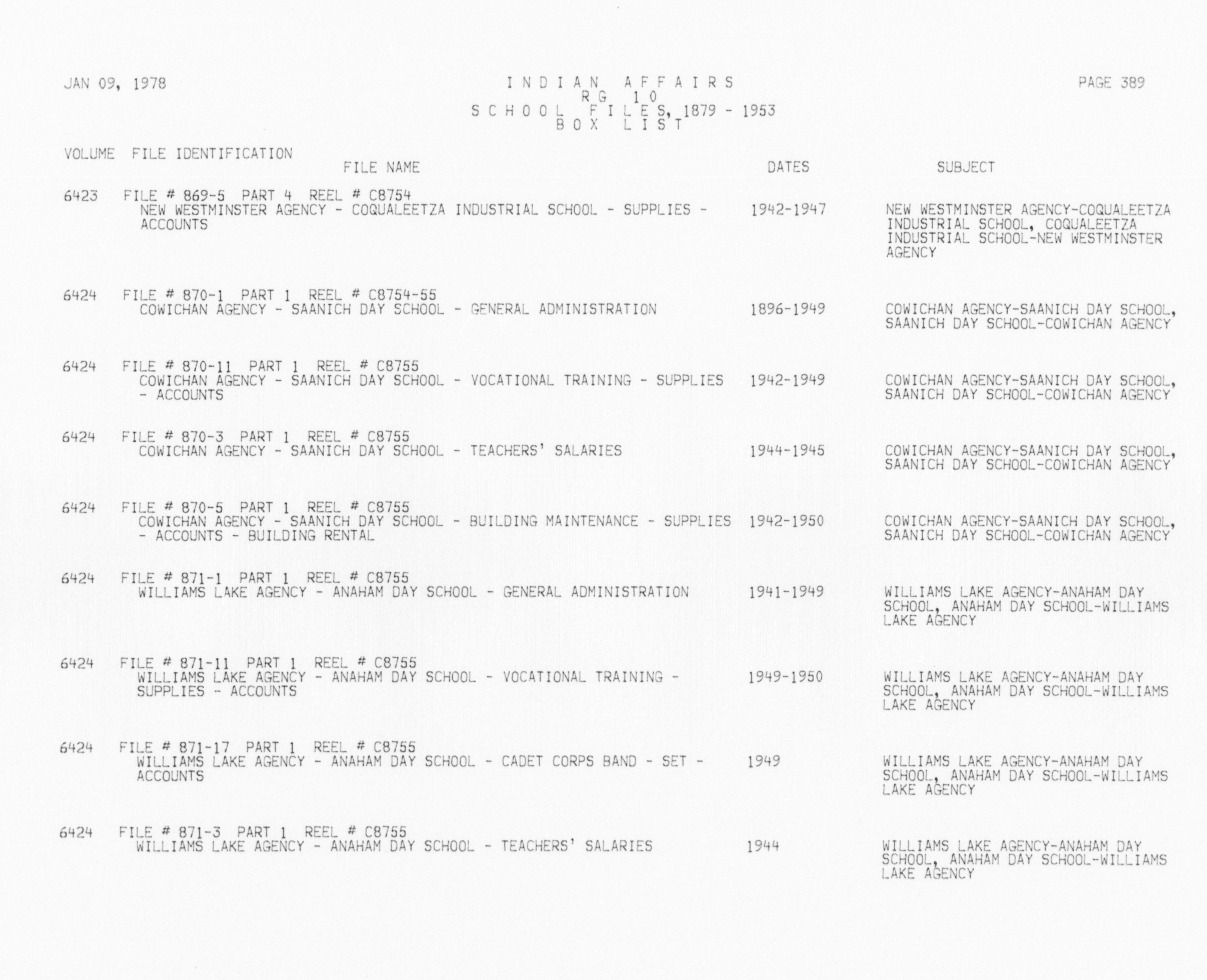 Department of Indian Affairs : School files series, Box List 1879-1953 - 9642