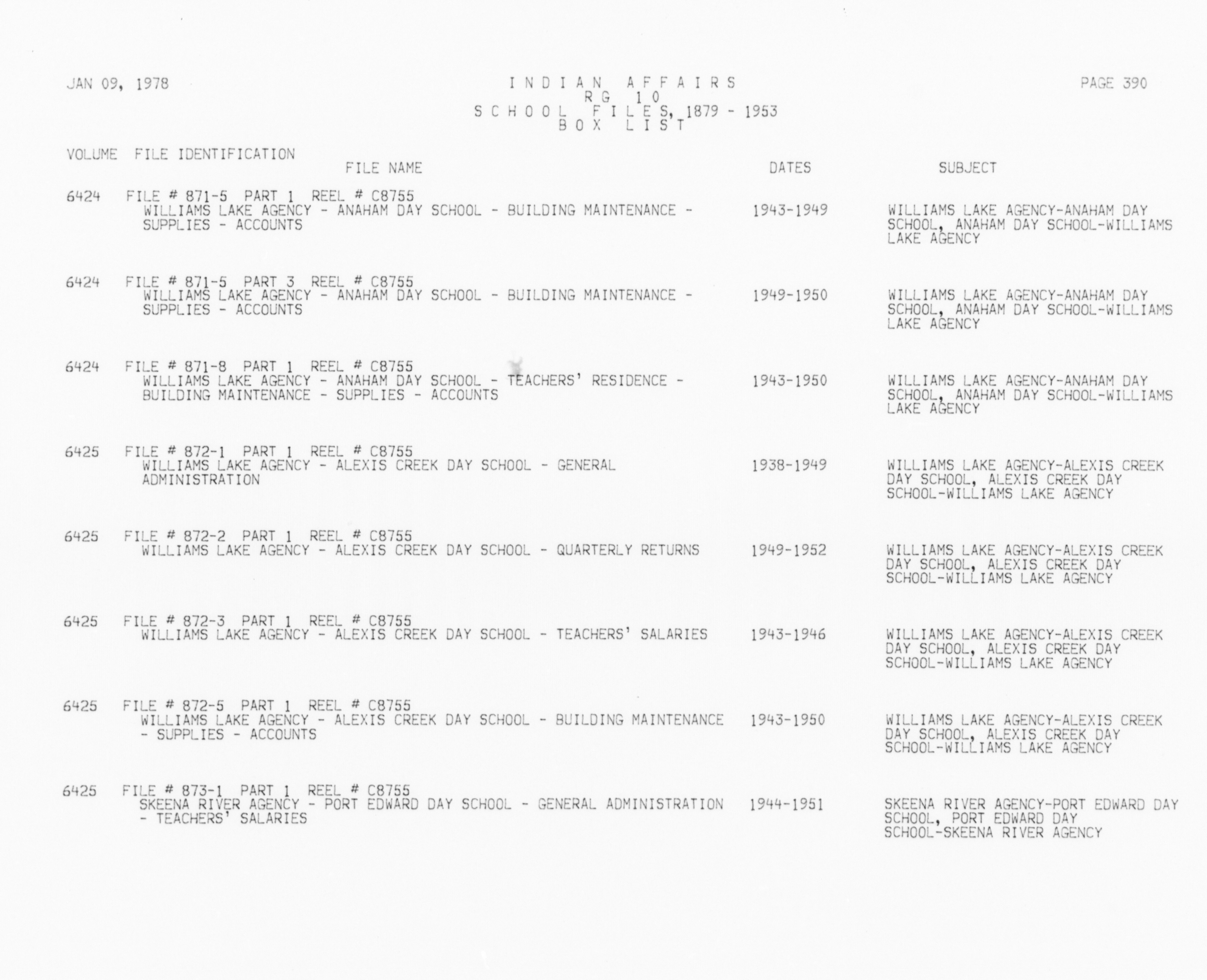 Department of Indian Affairs : School files series, Box List 1879-1953 - 9642