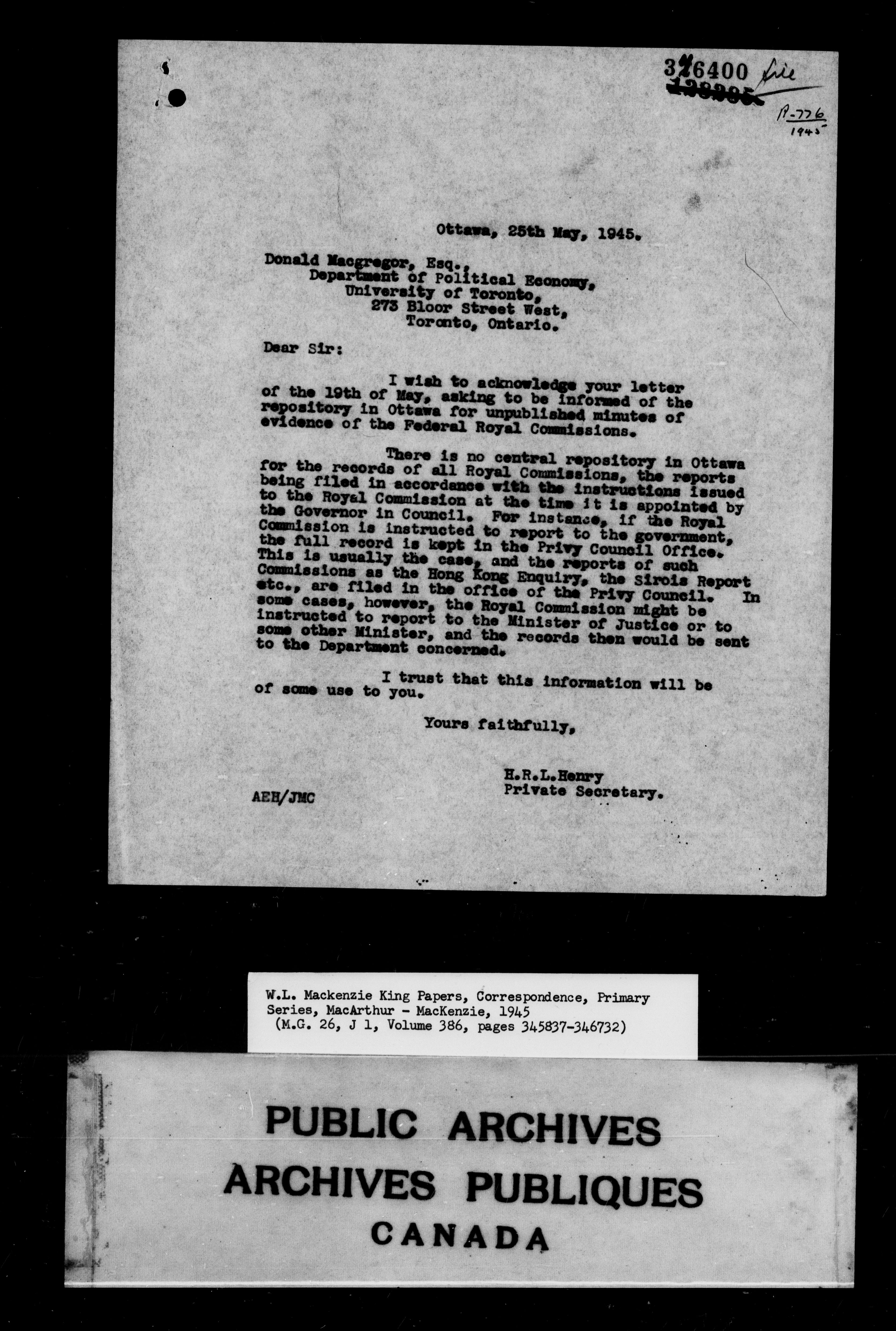 William Lyon Mackenzie King : Primary series correspondence (J1) - 9877