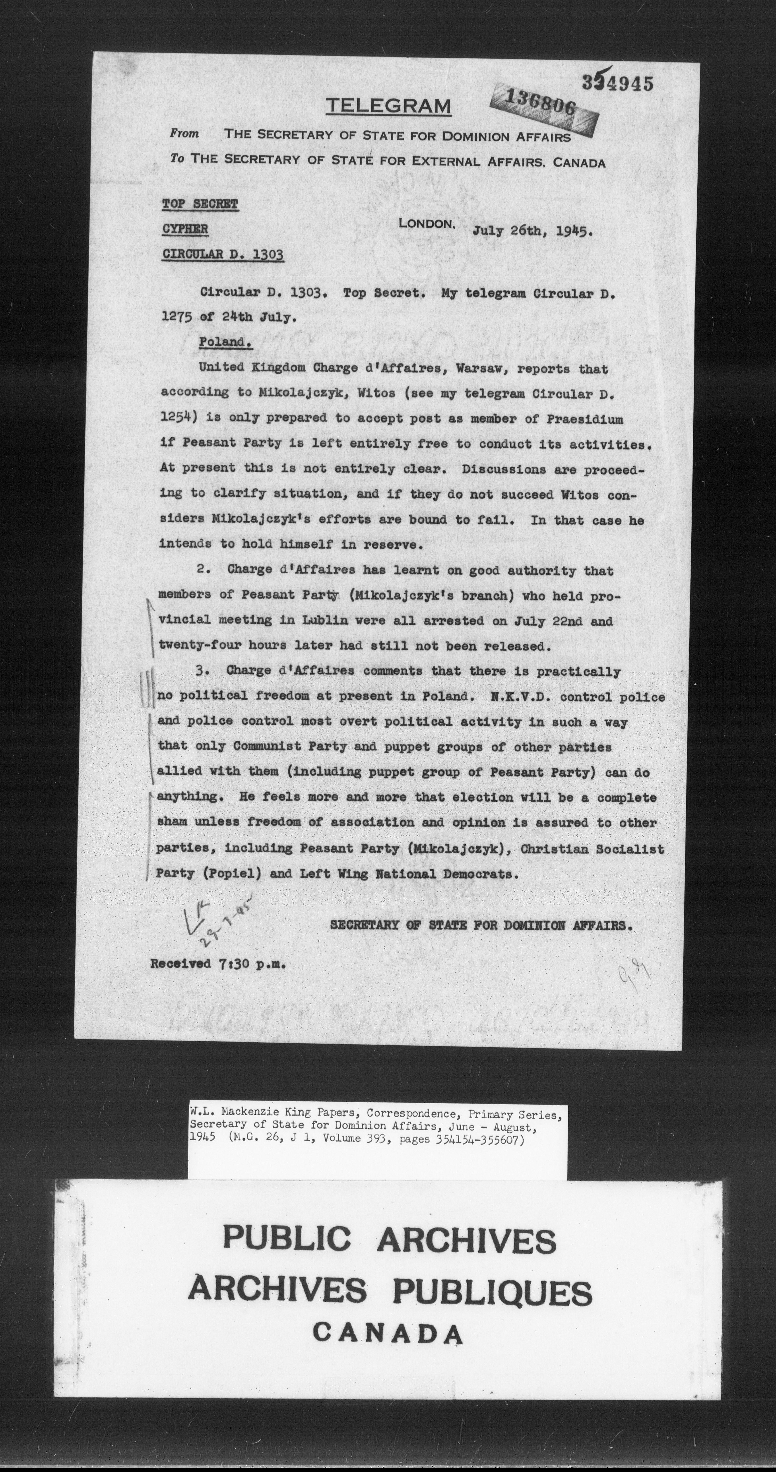 William Lyon Mackenzie King : Primary series correspondence (J1) - 9883