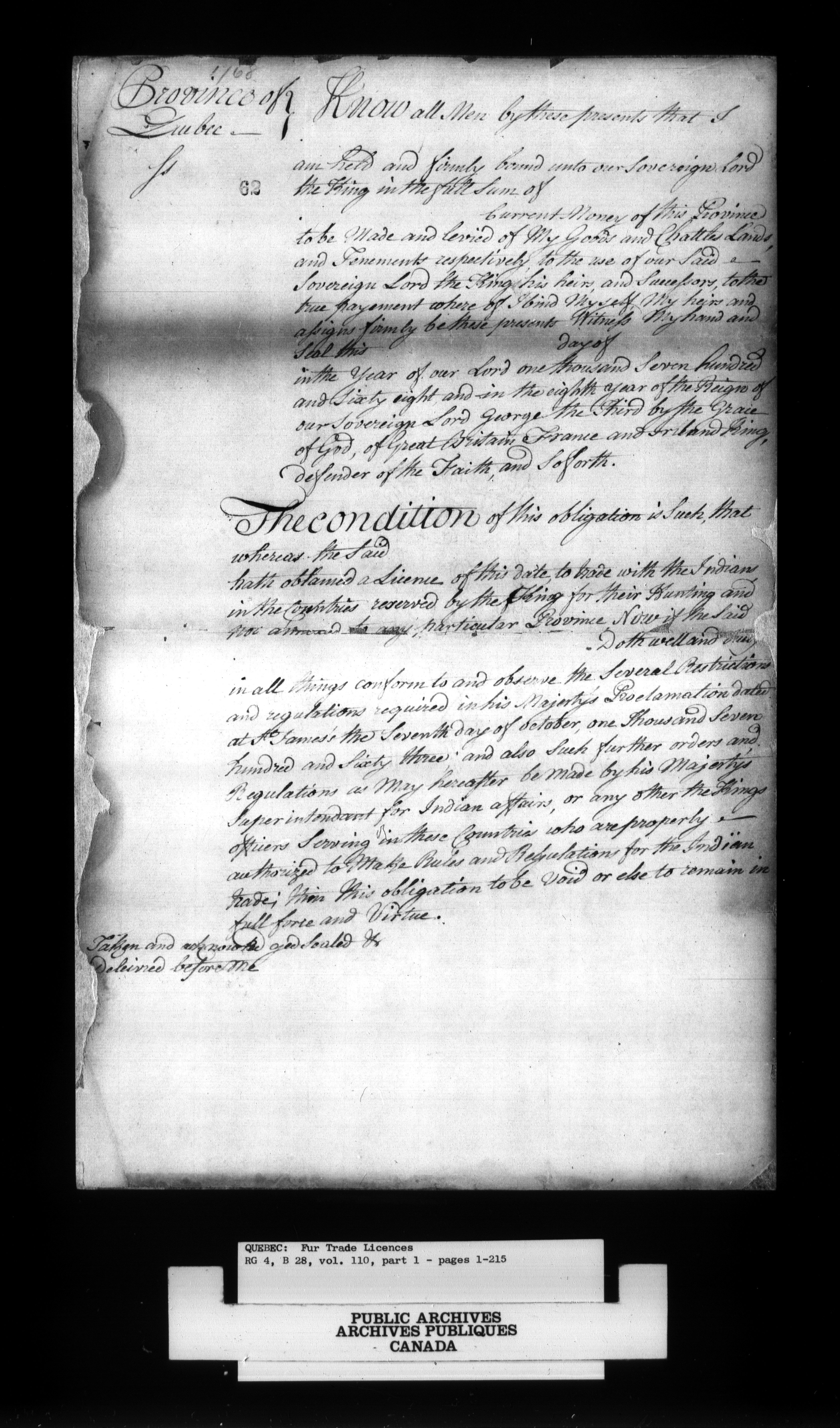 Quebec & Lower Canada : Bonds and licences for the fur trade - 1096