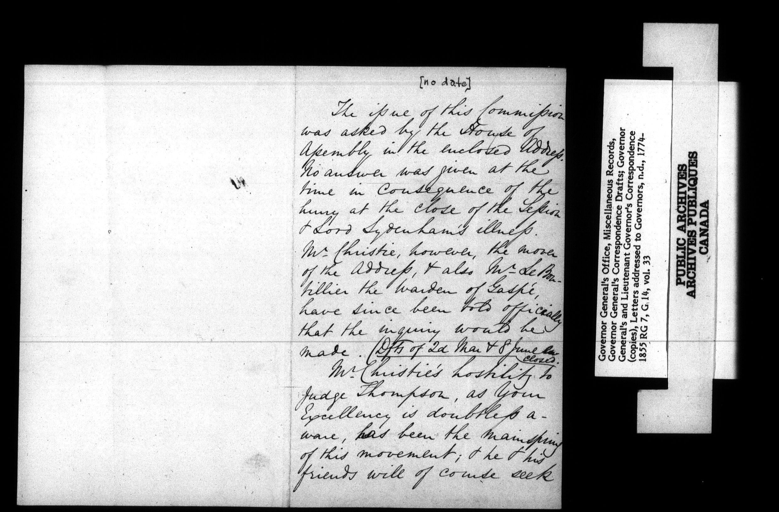 [Correspondence received by the Governor-in-Chief of Lower Canada, the Governor-in-Chief of the Province of Canada, and the Governor General of the Dominion of Canada] : H-1187