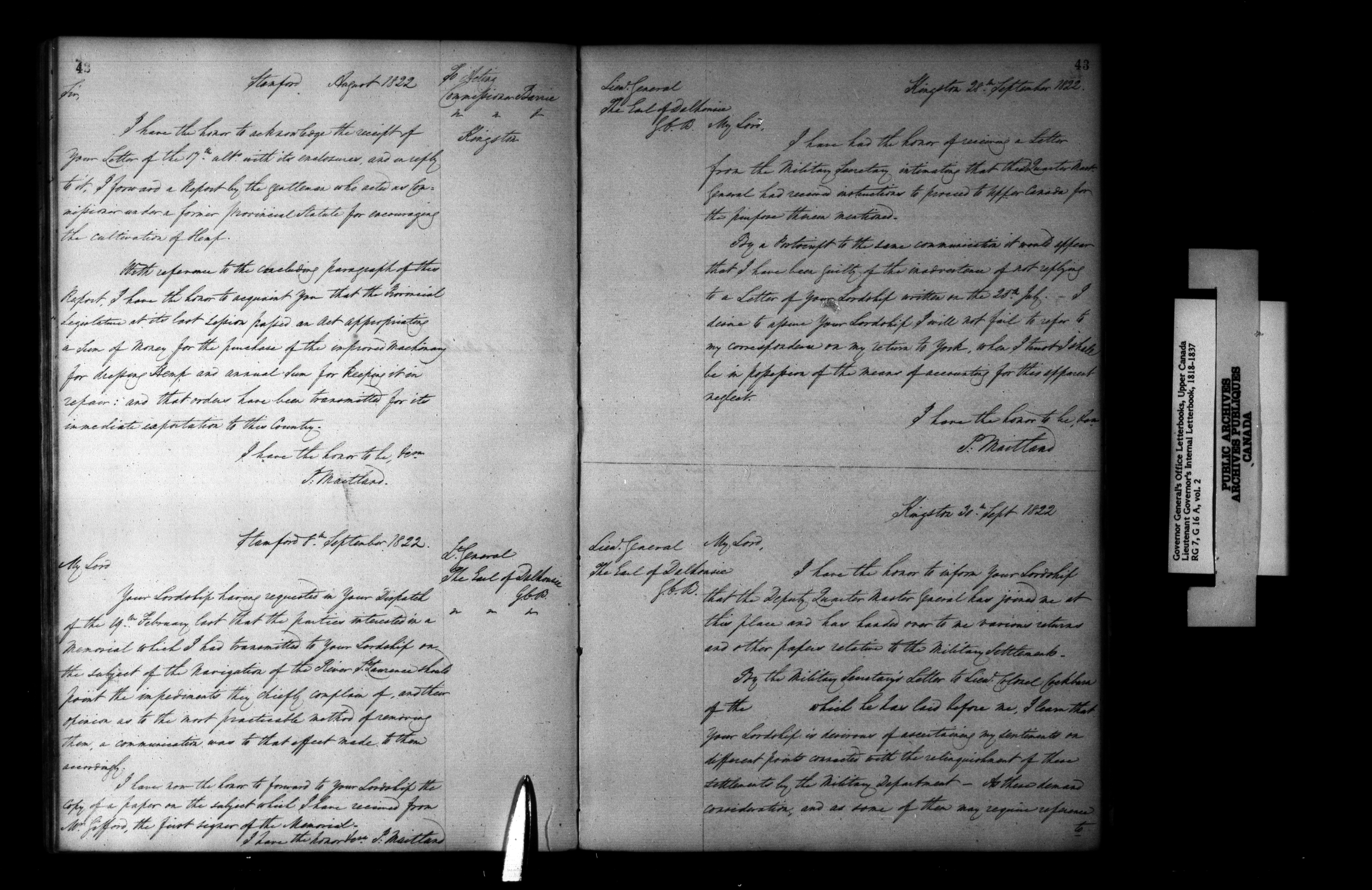 Canada : Governor General's Office, Internal Letterbooks, Upper Canada to and from Treasury : H-1200