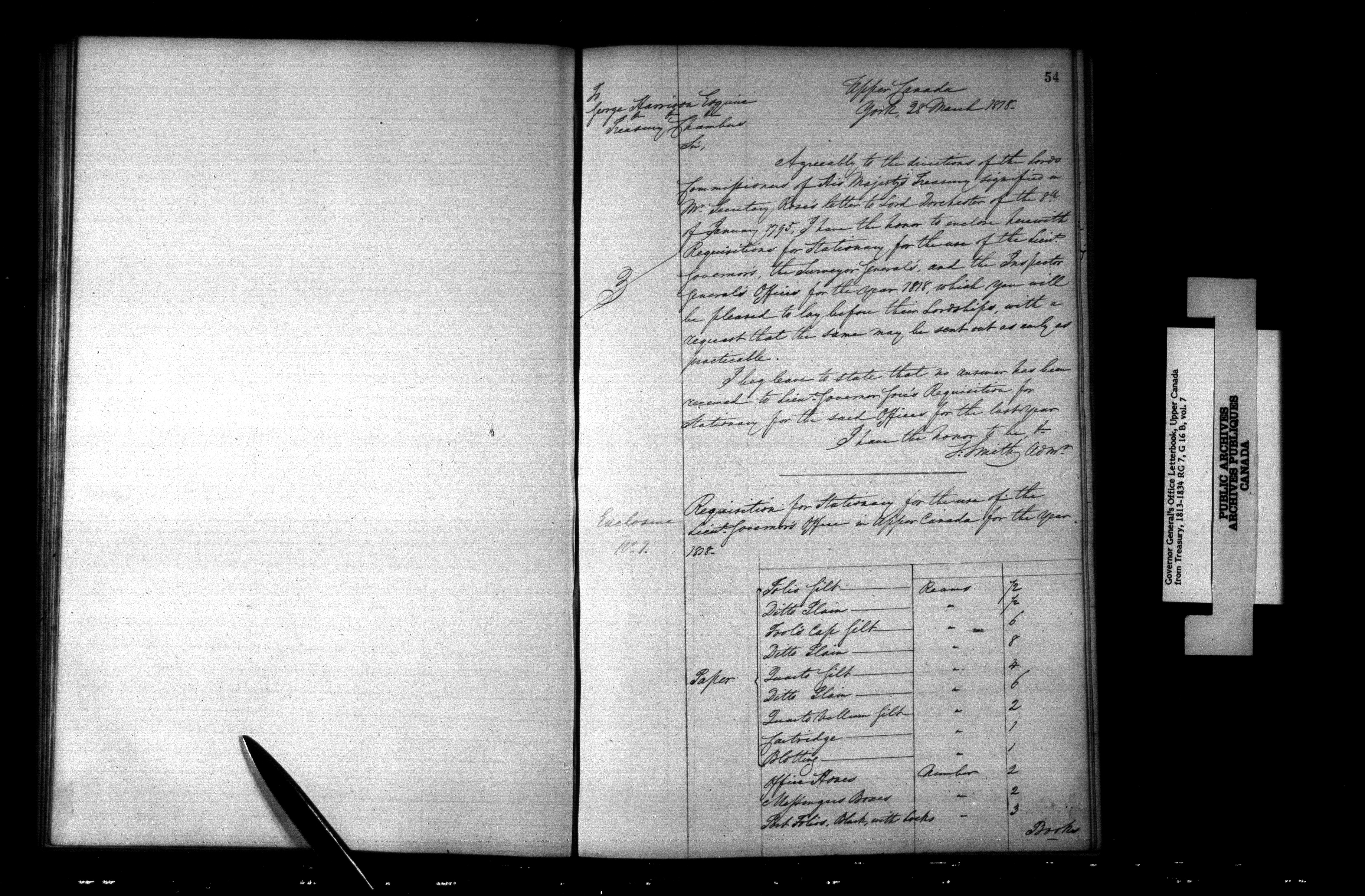Canada : Governor General's Office, Internal Letterbooks, Upper Canada to and from Treasury : H-1200