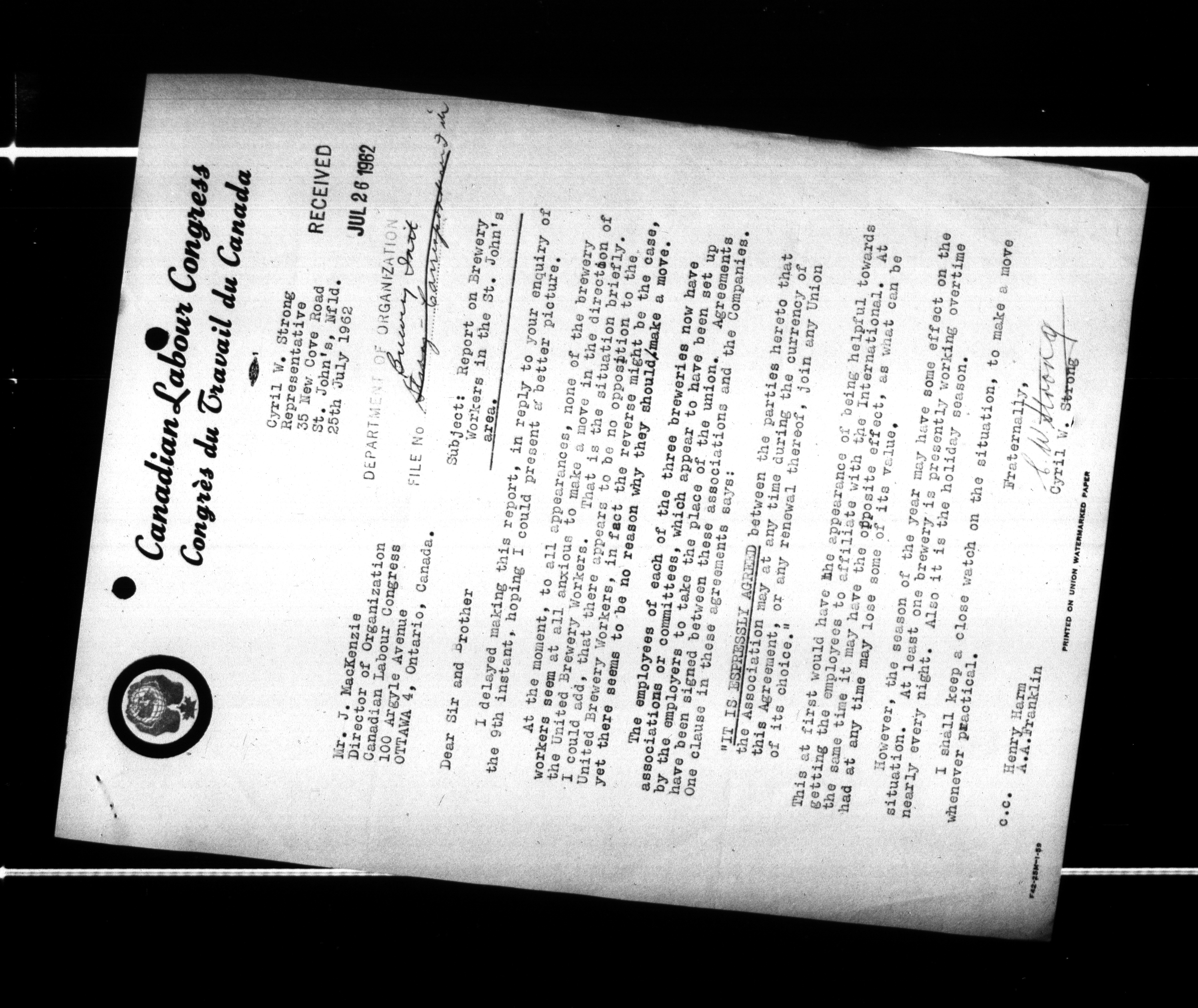 Canadian Labour Congress : Organization Department files : H-123