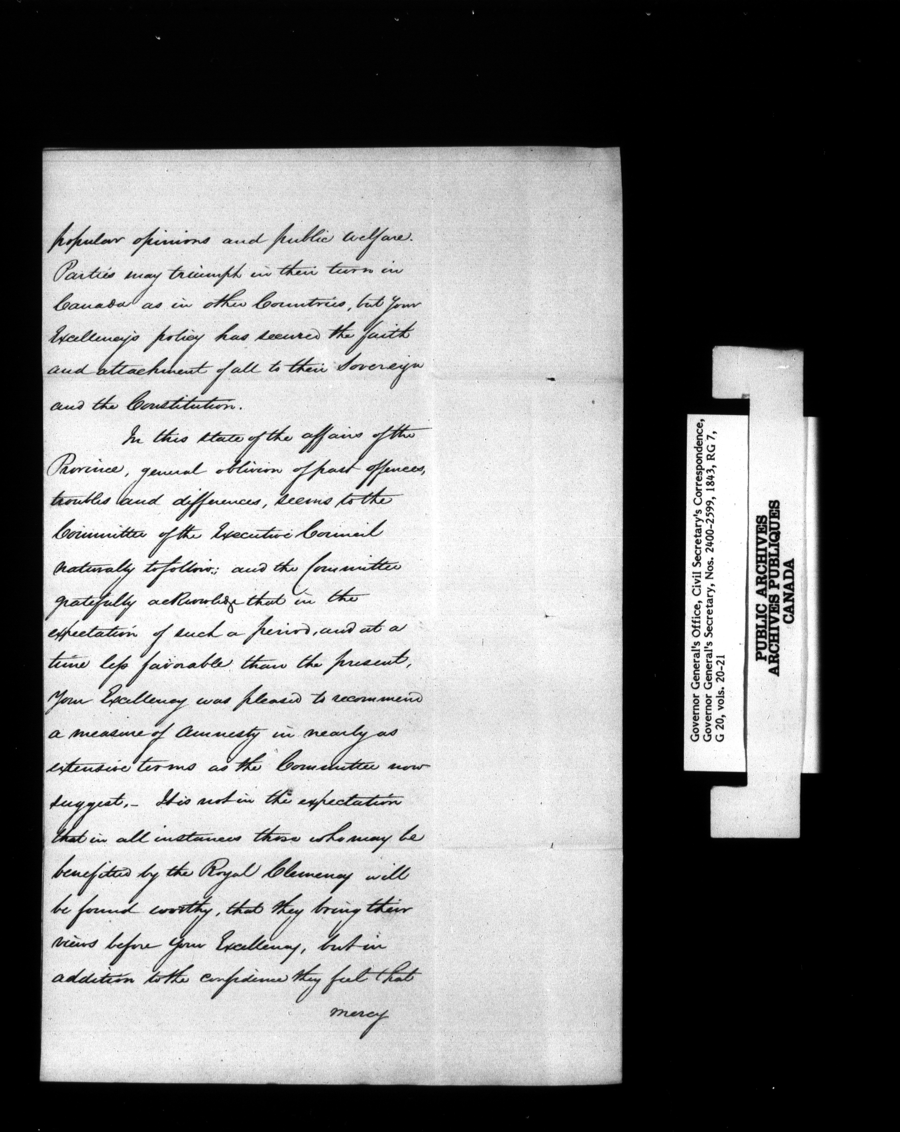 Canada: Governor General's Office, Civil Secretary's correspondence [Province of Canada] - 1354