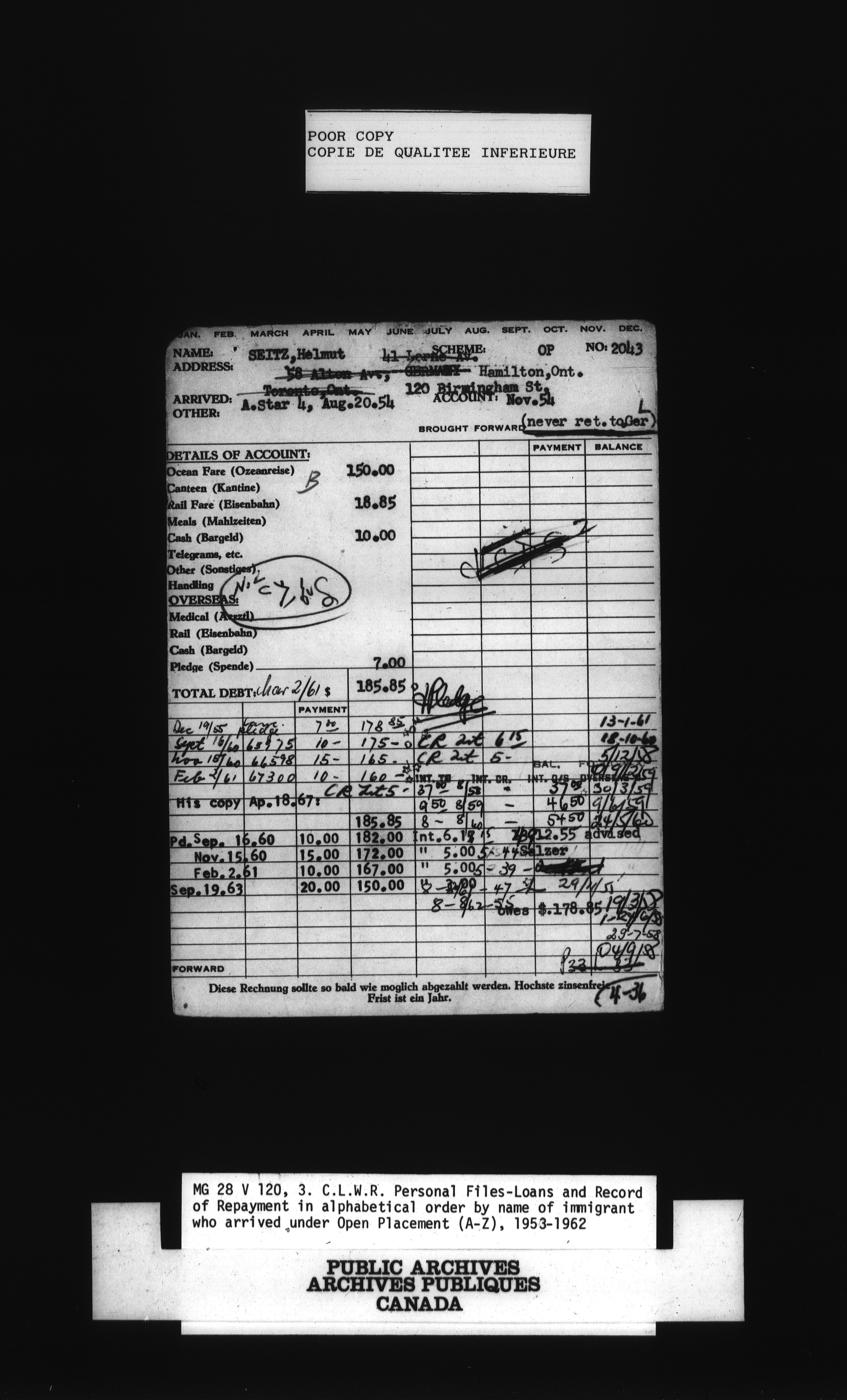 Canadian Lutheran World Relief personnel files, loans and record of repayment in alphabetical order by name of immigrant - 1385