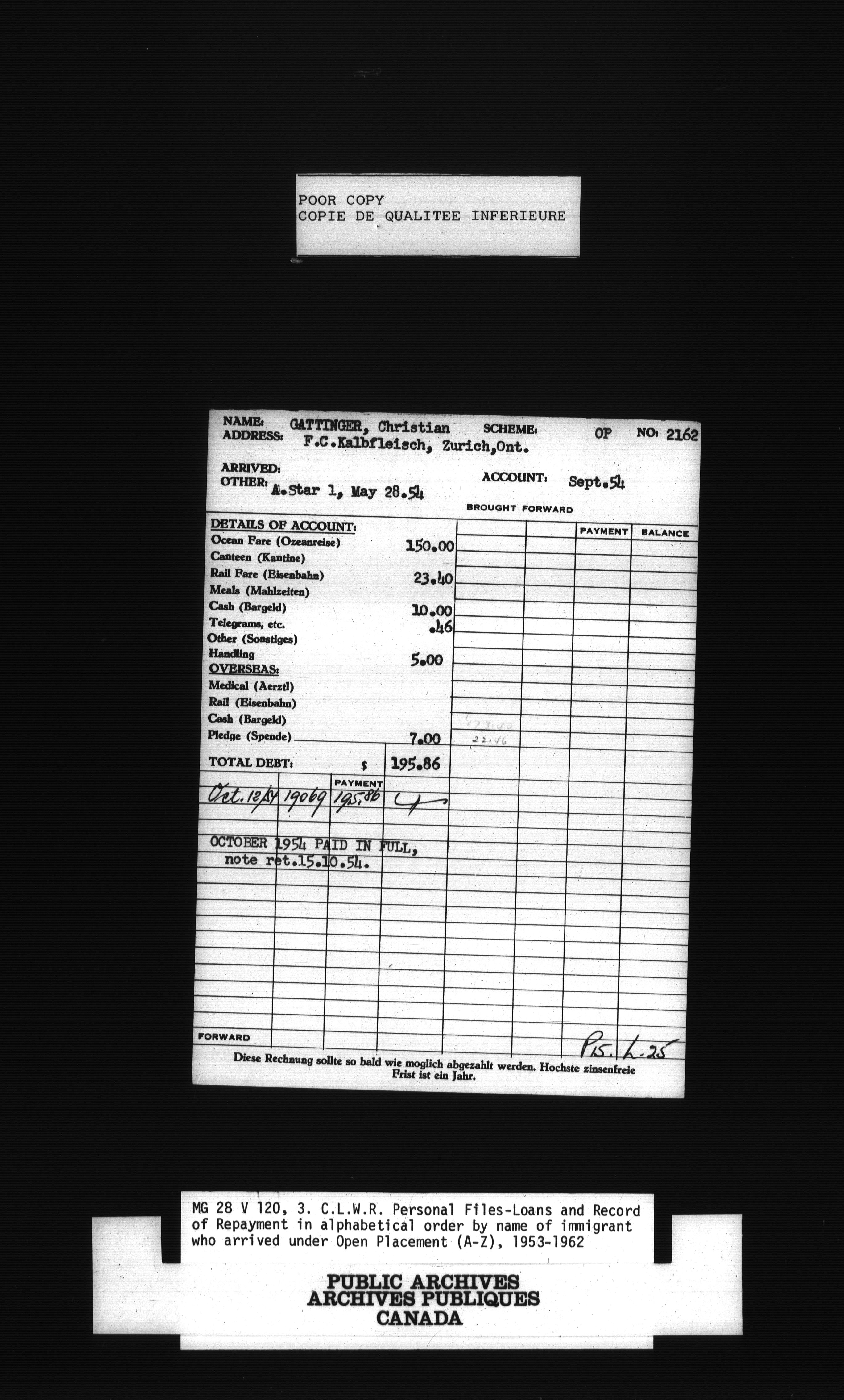 Canadian Lutheran World Relief personnel files, loans and record of repayment in alphabetical order by name of immigrant - 1385