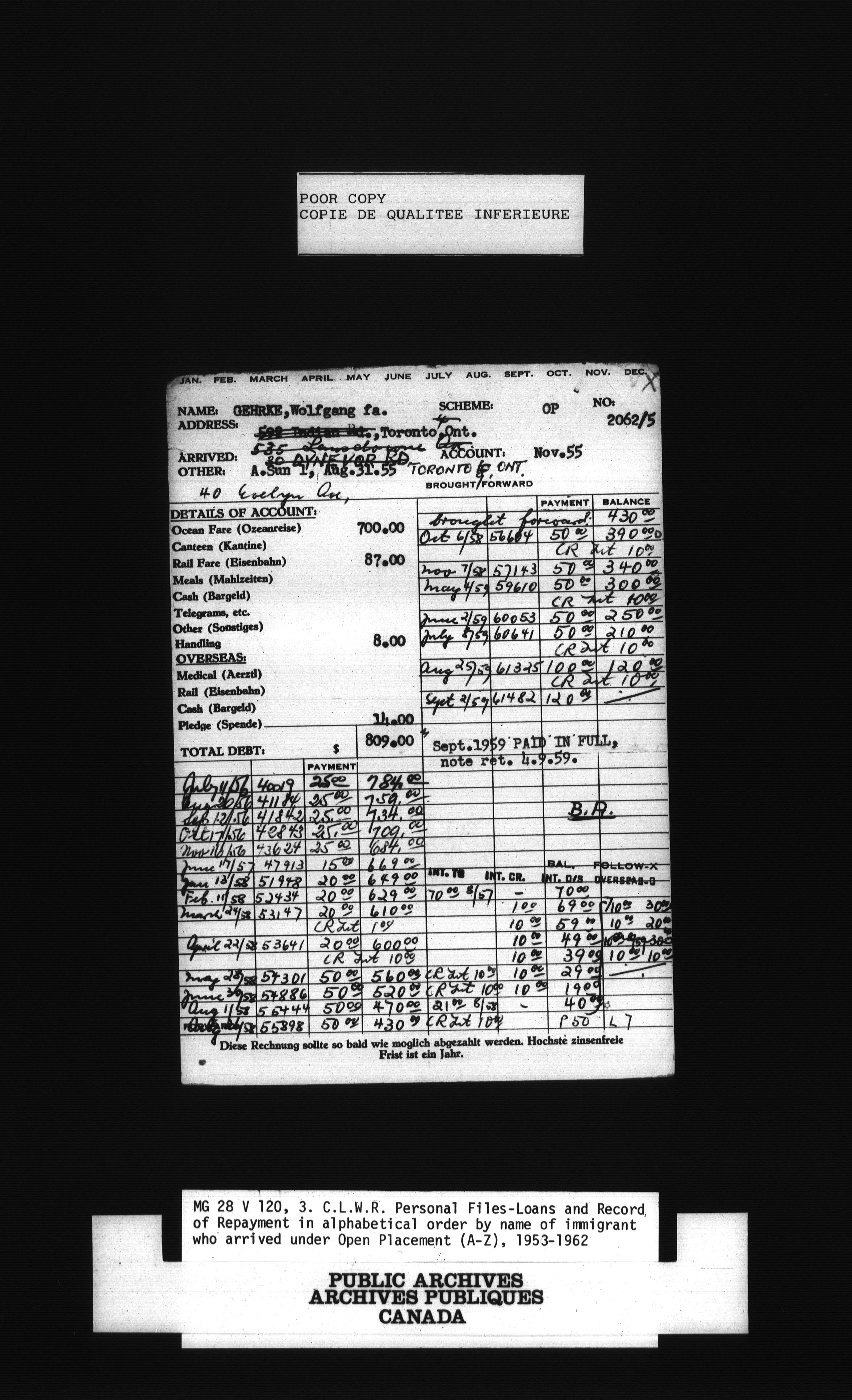 Canadian Lutheran World Relief personnel files, loans and record of repayment in alphabetical order by name of immigrant - 1385