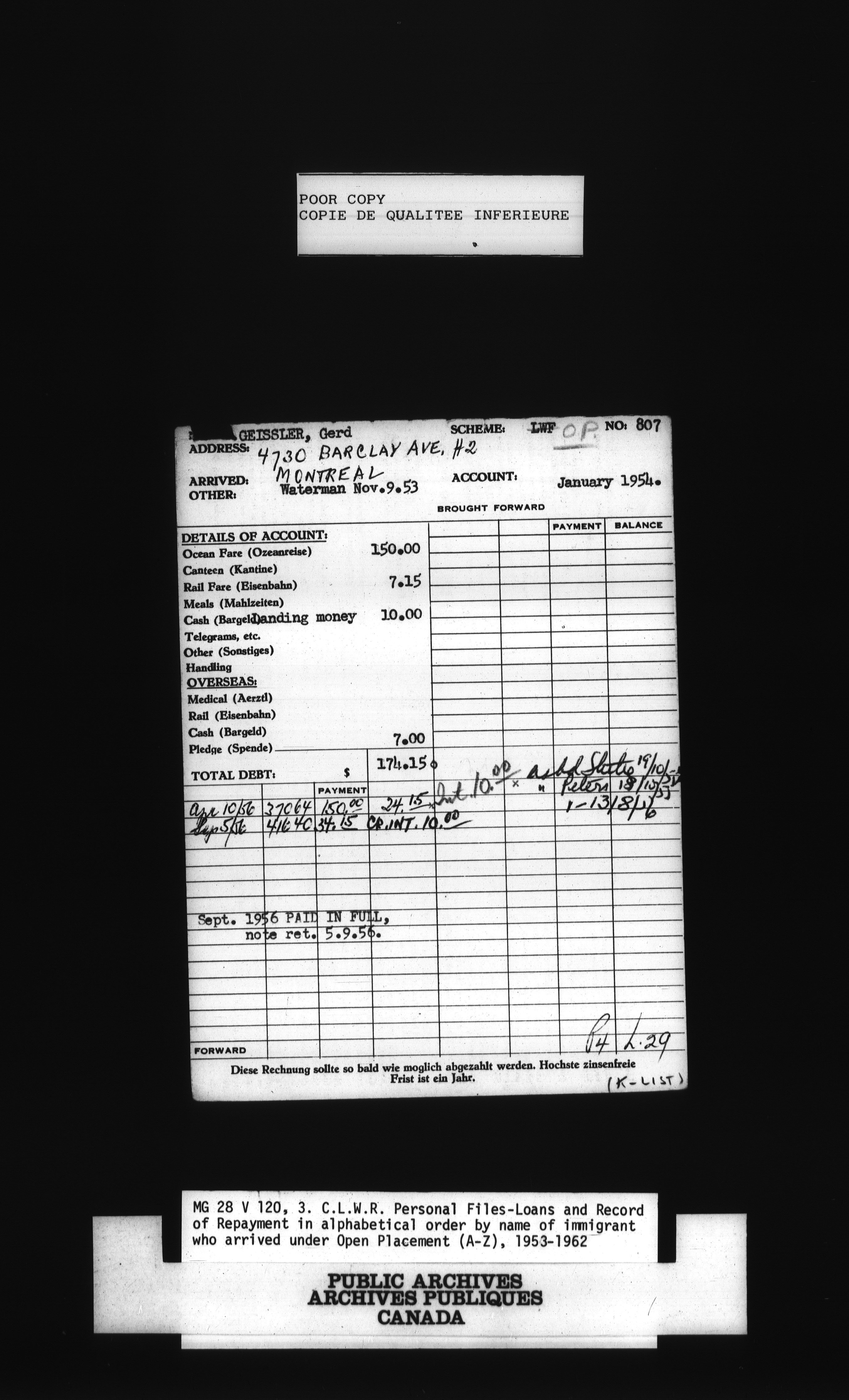 Canadian Lutheran World Relief personnel files, loans and record of repayment in alphabetical order by name of immigrant - 1385