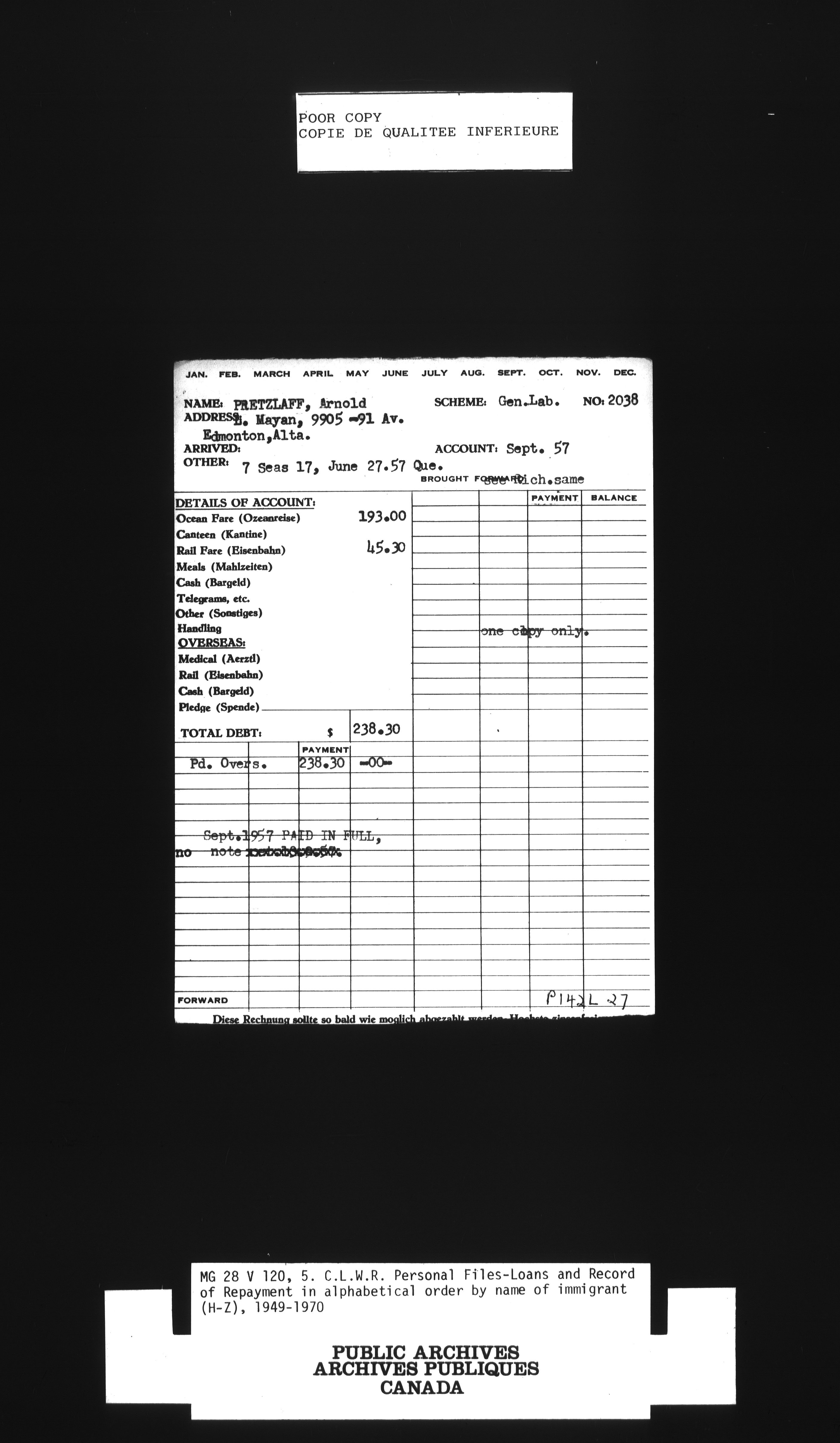 Canadian Lutheran World Relief personnel files, loans and record of repayment in alphabetical order by name of immigrant - 1388