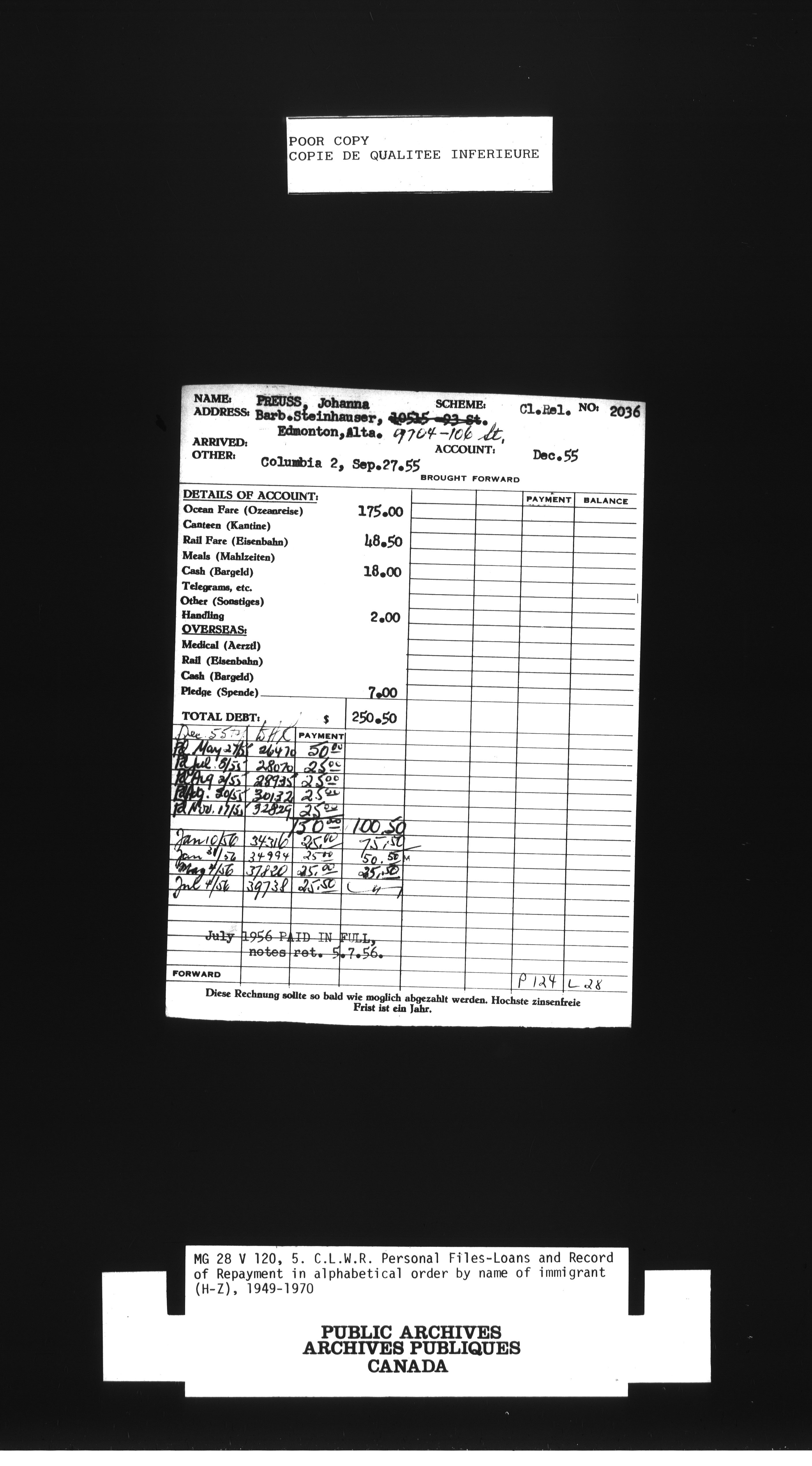 Canadian Lutheran World Relief personnel files, loans and record of repayment in alphabetical order by name of immigrant - 1388
