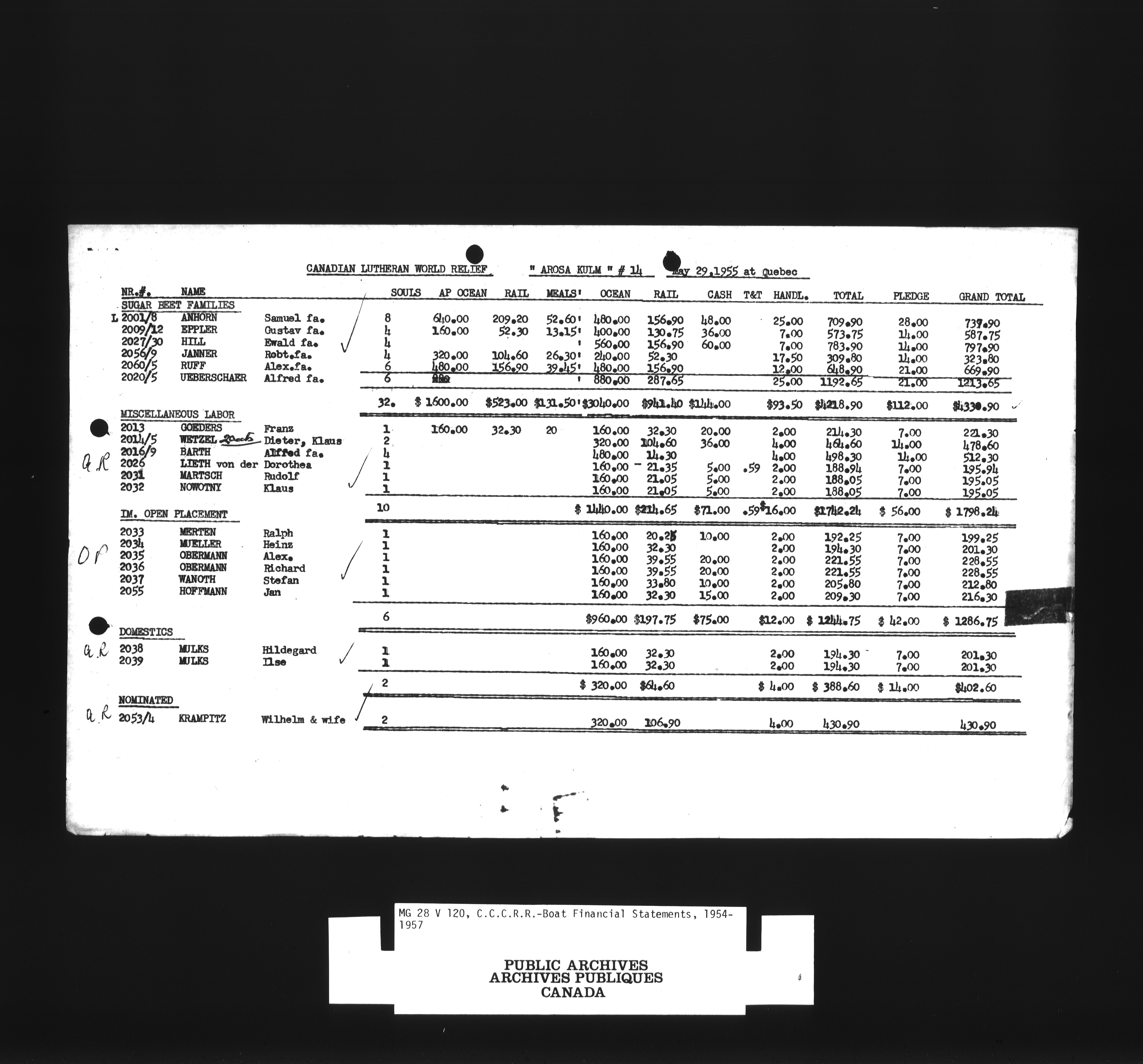 Canadian Lutheran World Relief personnel files, loans and record of repayment in alphabetical order by name of immigrantCanadian Christian Council for resettlement of refugees, boat financial statements - 1389