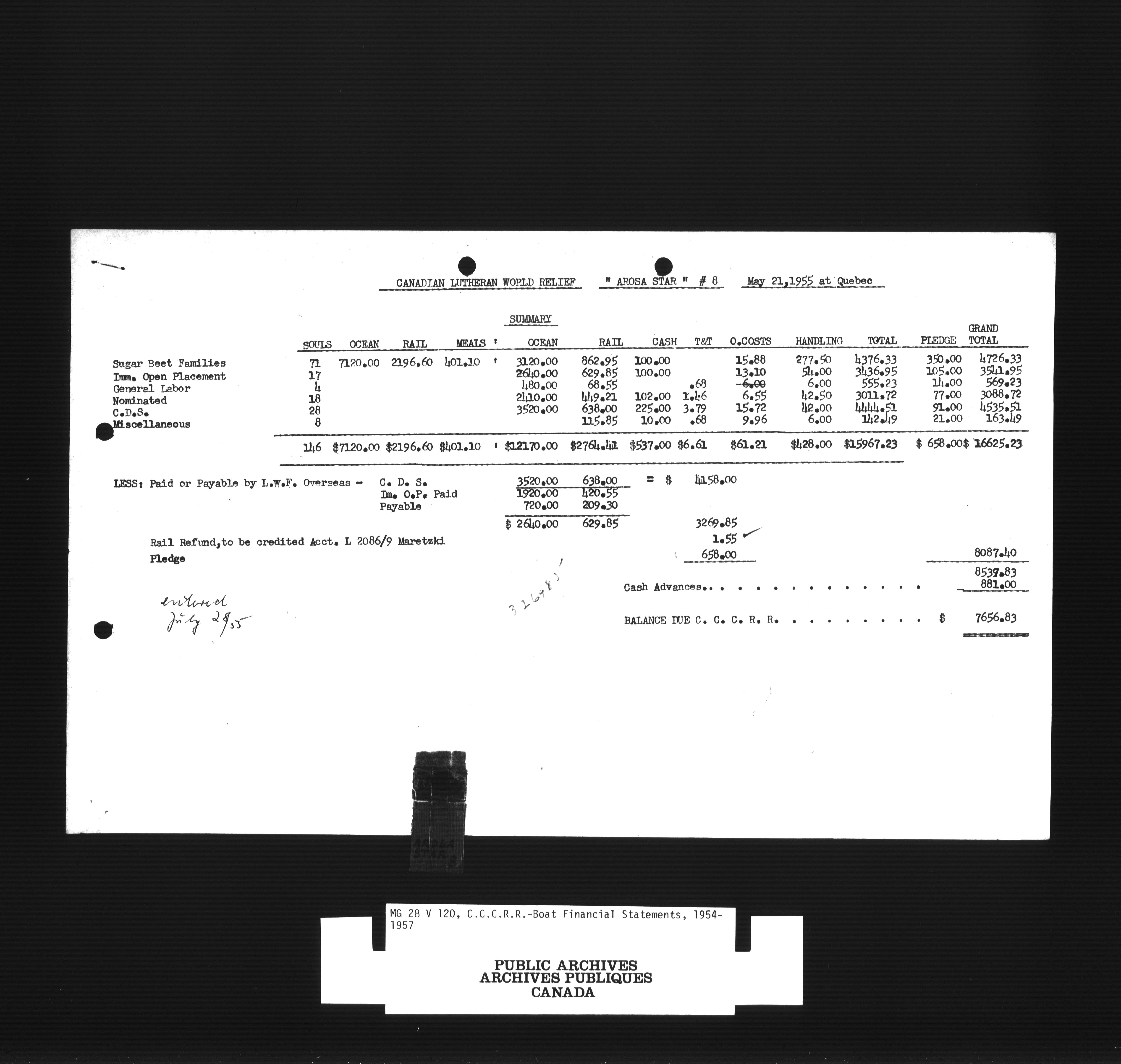 Canadian Lutheran World Relief personnel files, loans and record of repayment in alphabetical order by name of immigrantCanadian Christian Council for resettlement of refugees, boat financial statements - 1389