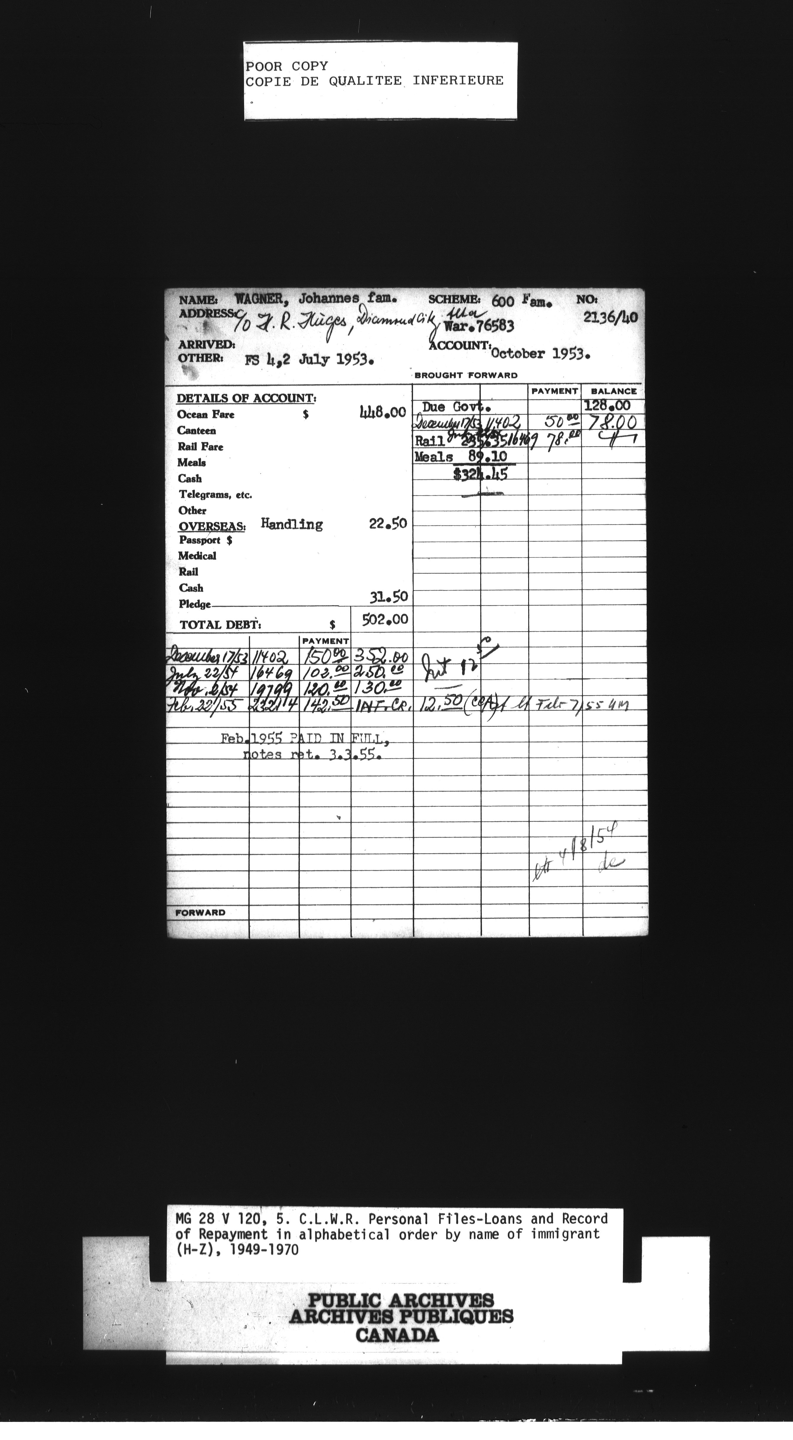 Canadian Lutheran World Relief personnel files, loans and record of repayment in alphabetical order by name of immigrantCanadian Christian Council for resettlement of refugees, boat financial statements - 1389