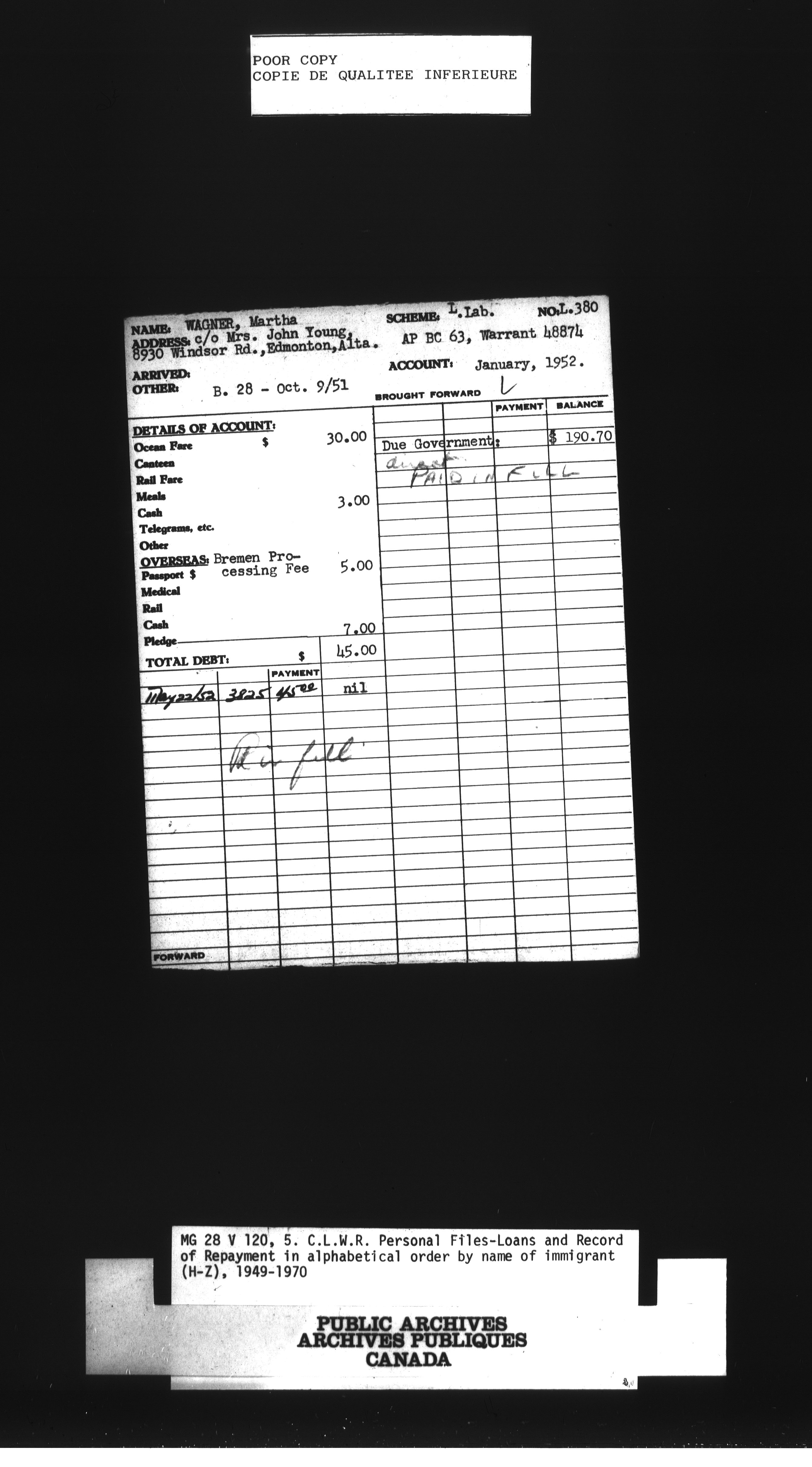 Canadian Lutheran World Relief personnel files, loans and record of repayment in alphabetical order by name of immigrantCanadian Christian Council for resettlement of refugees, boat financial statements - 1389