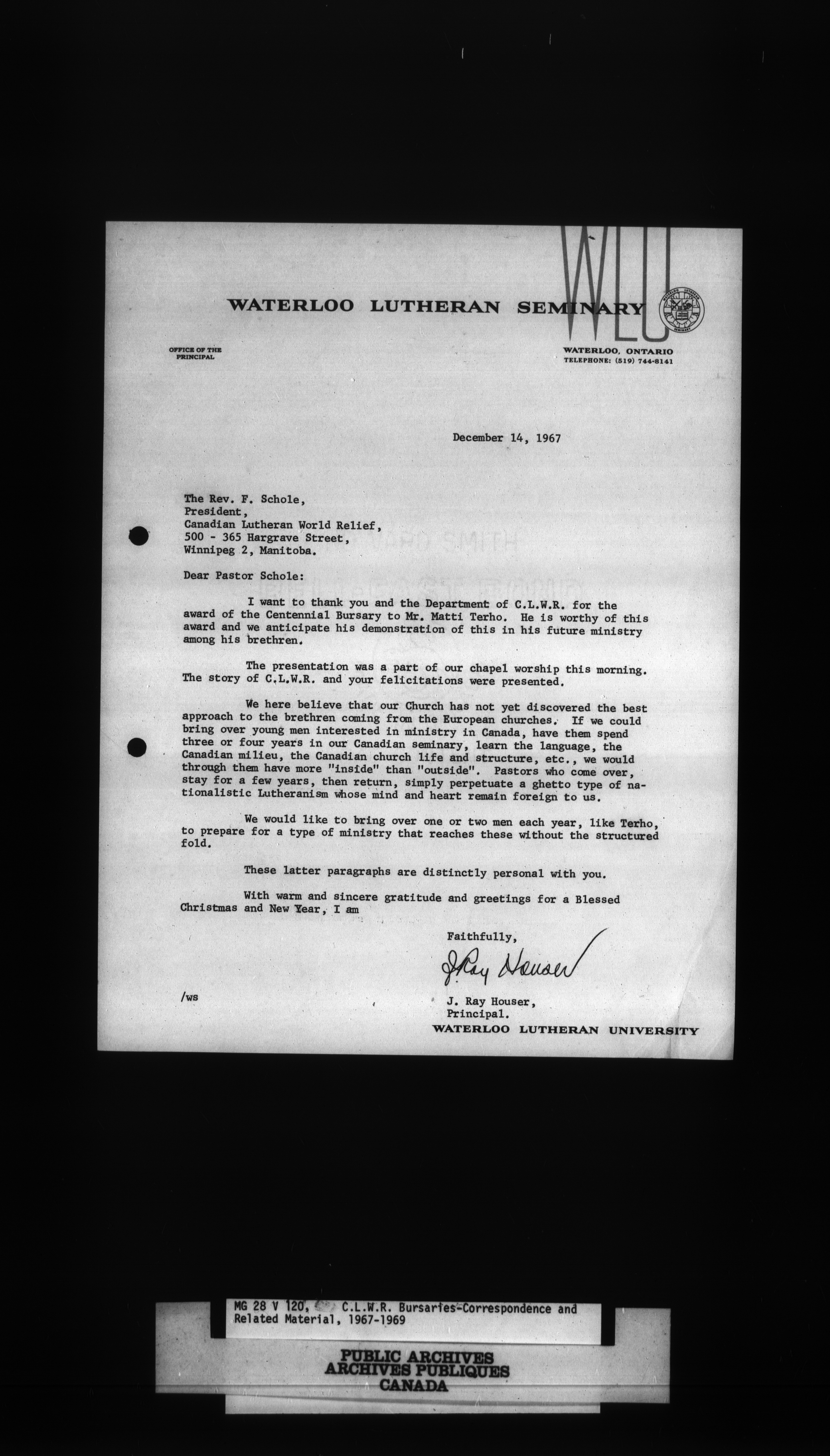 Canadian Lutheran World Relief, Bursaries correspondence and related materials - 1396