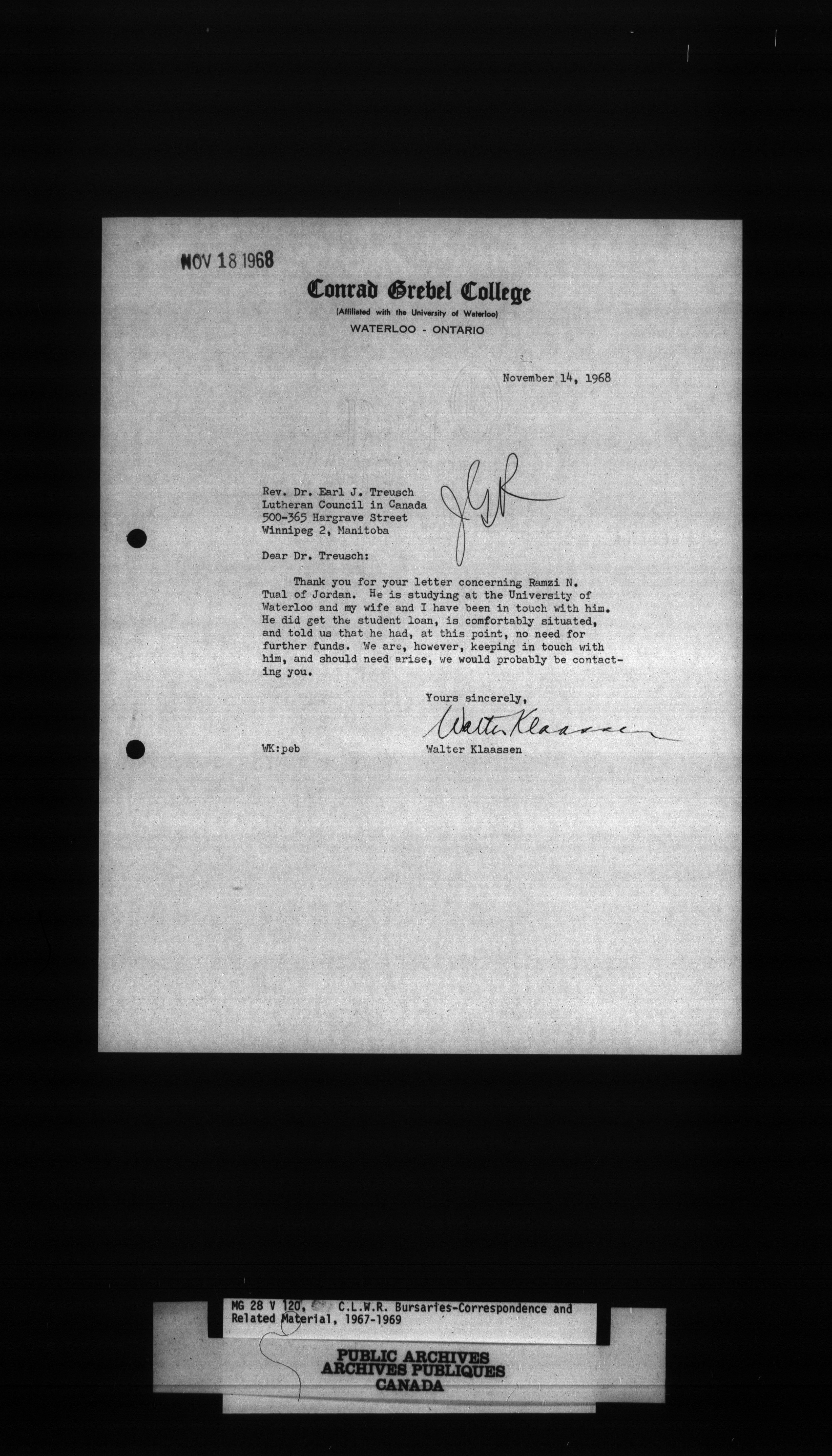 Canadian Lutheran World Relief, Bursaries correspondence and related materials - 1396