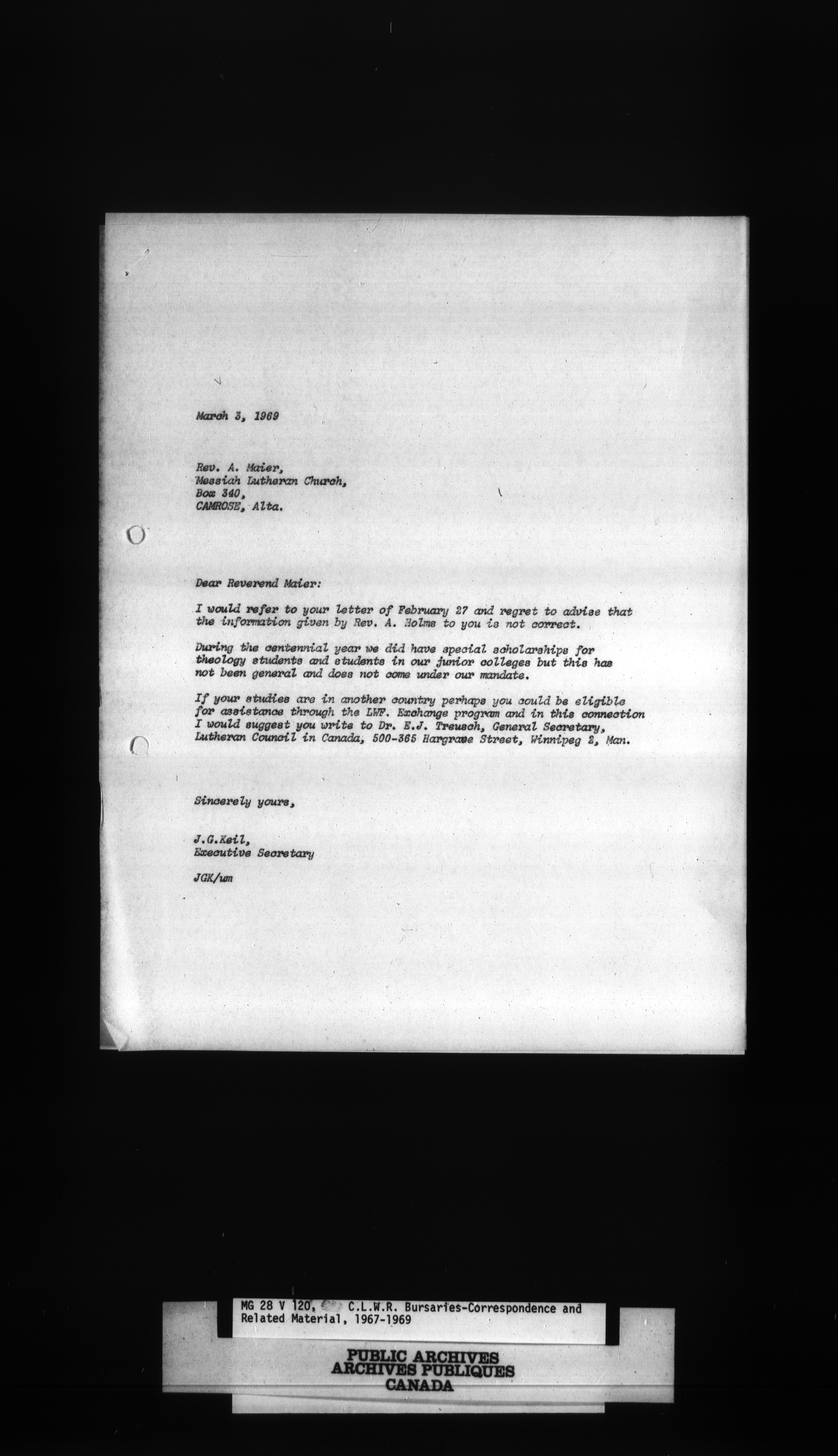 Canadian Lutheran World Relief, Bursaries correspondence and related materials - 1396