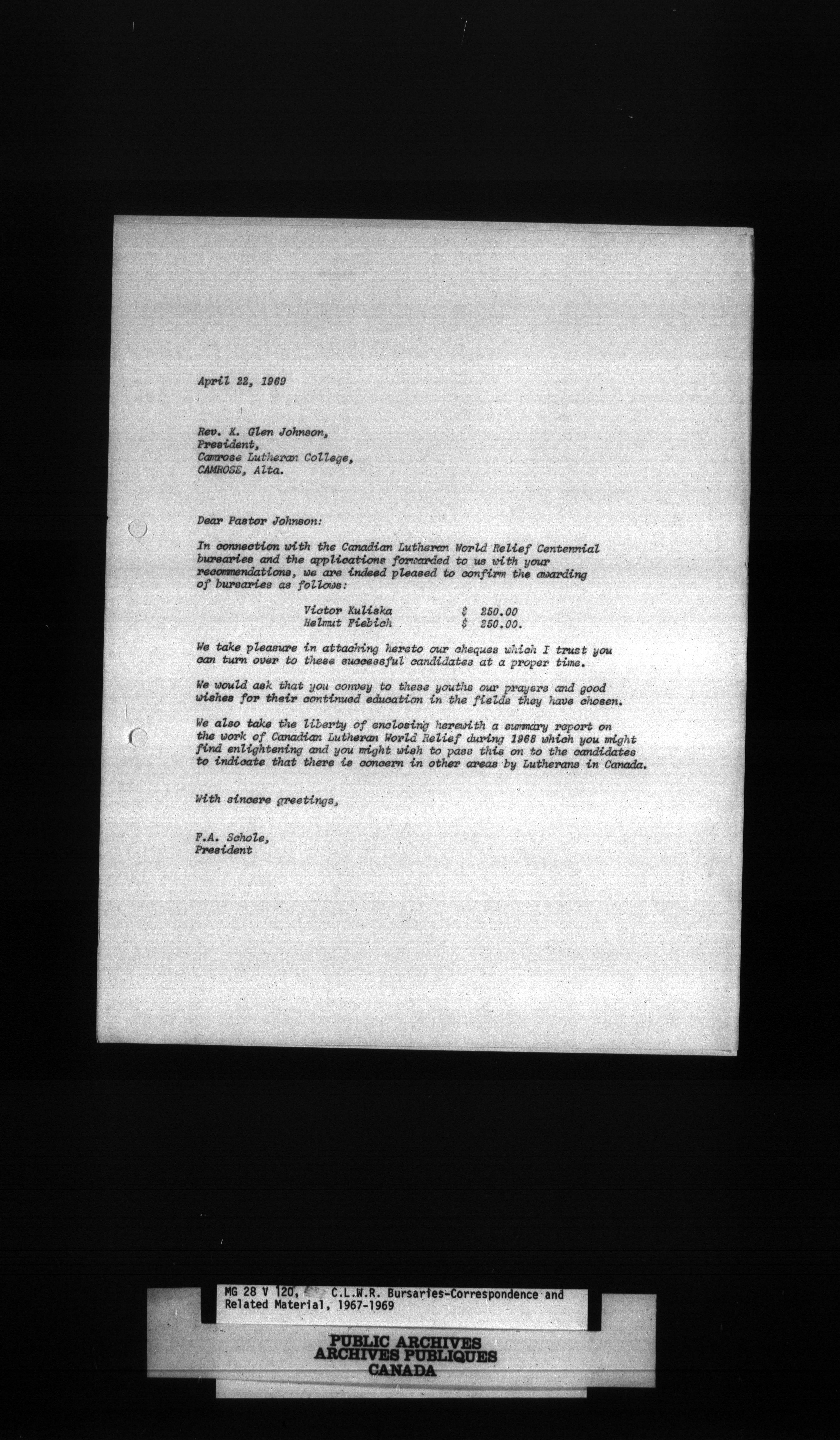 Canadian Lutheran World Relief, Bursaries correspondence and related materials - 1396