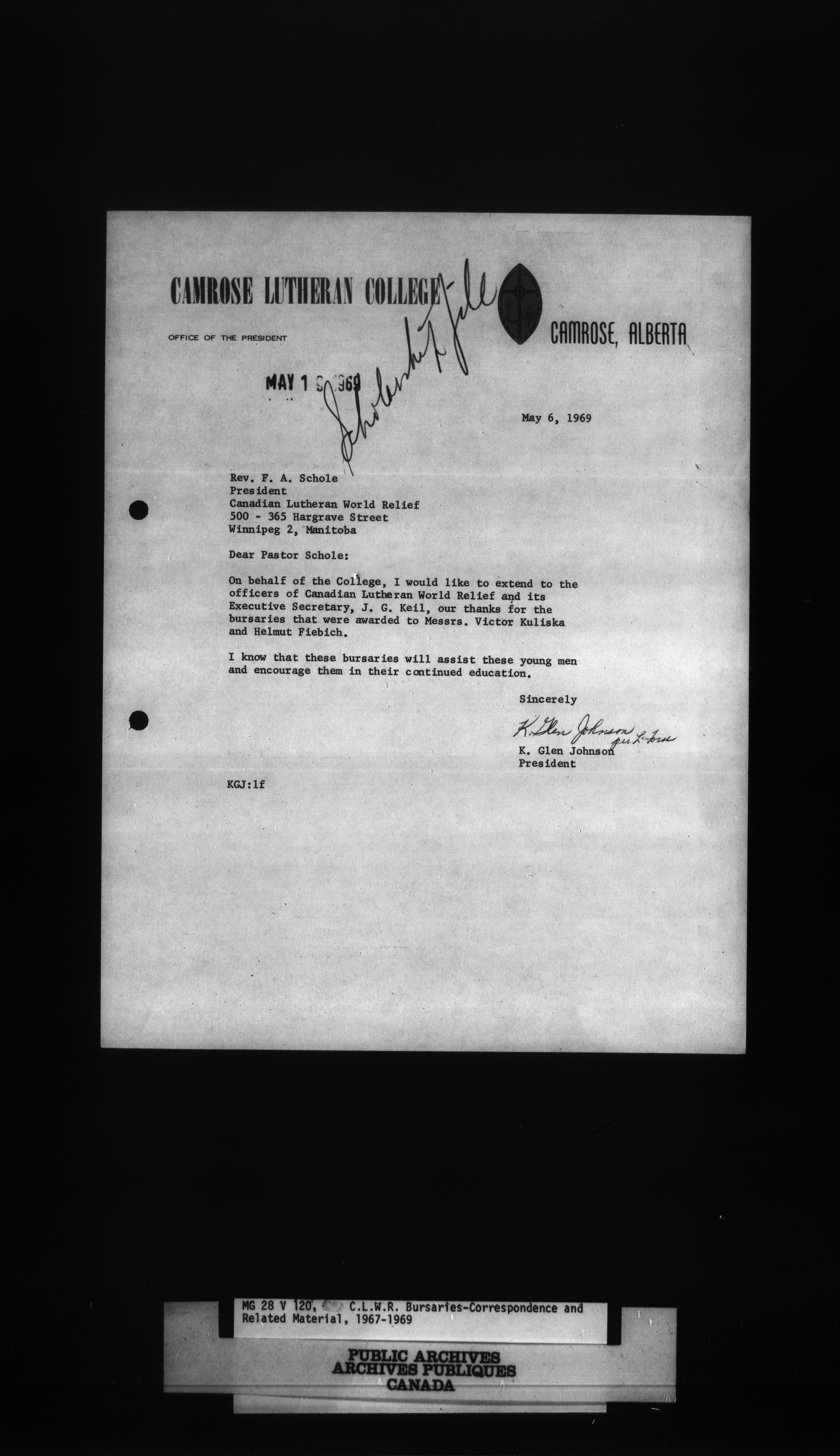Canadian Lutheran World Relief, Bursaries correspondence and related materials - 1396