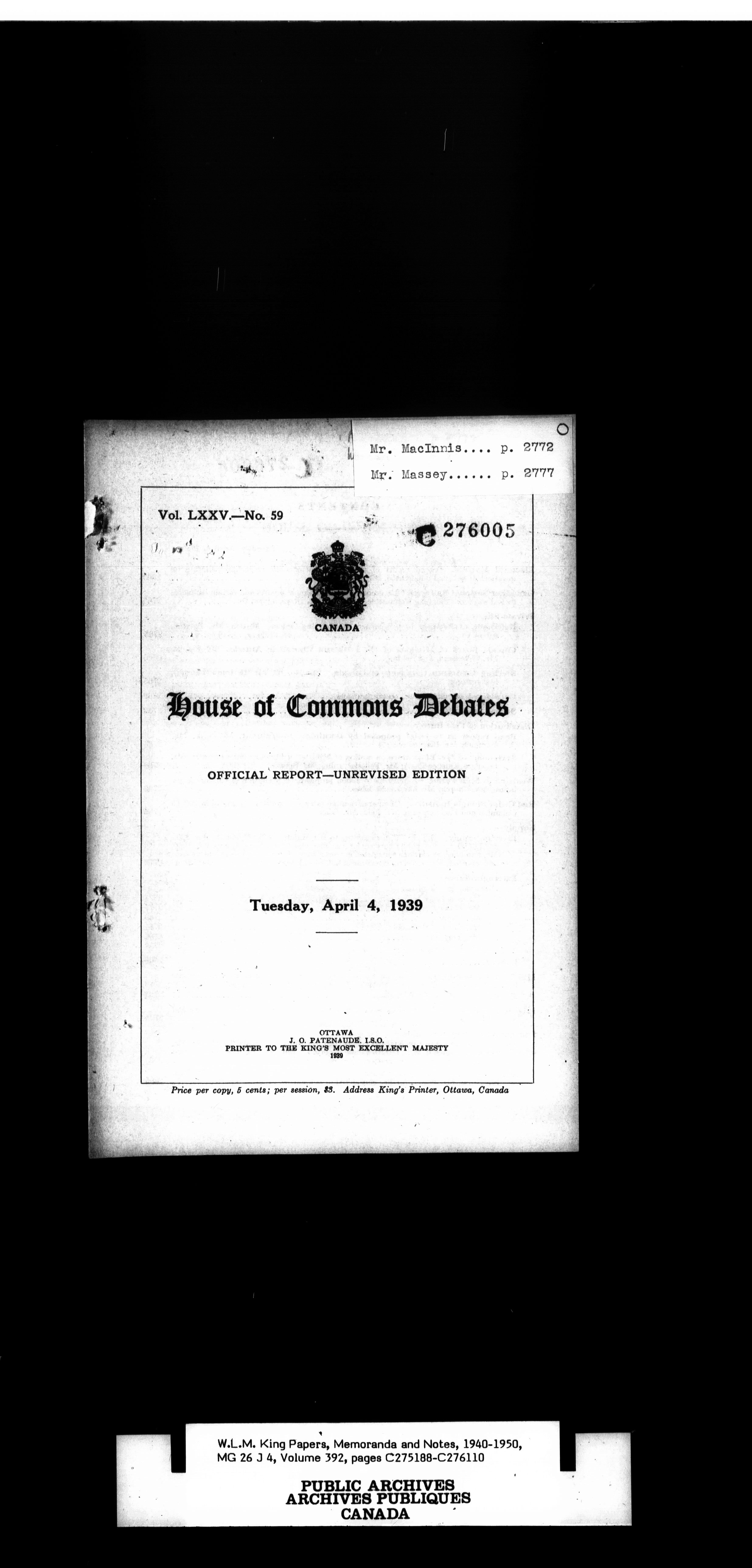 William Lyon Mackenzie King : Memoranda and notes (J4) : H-1554