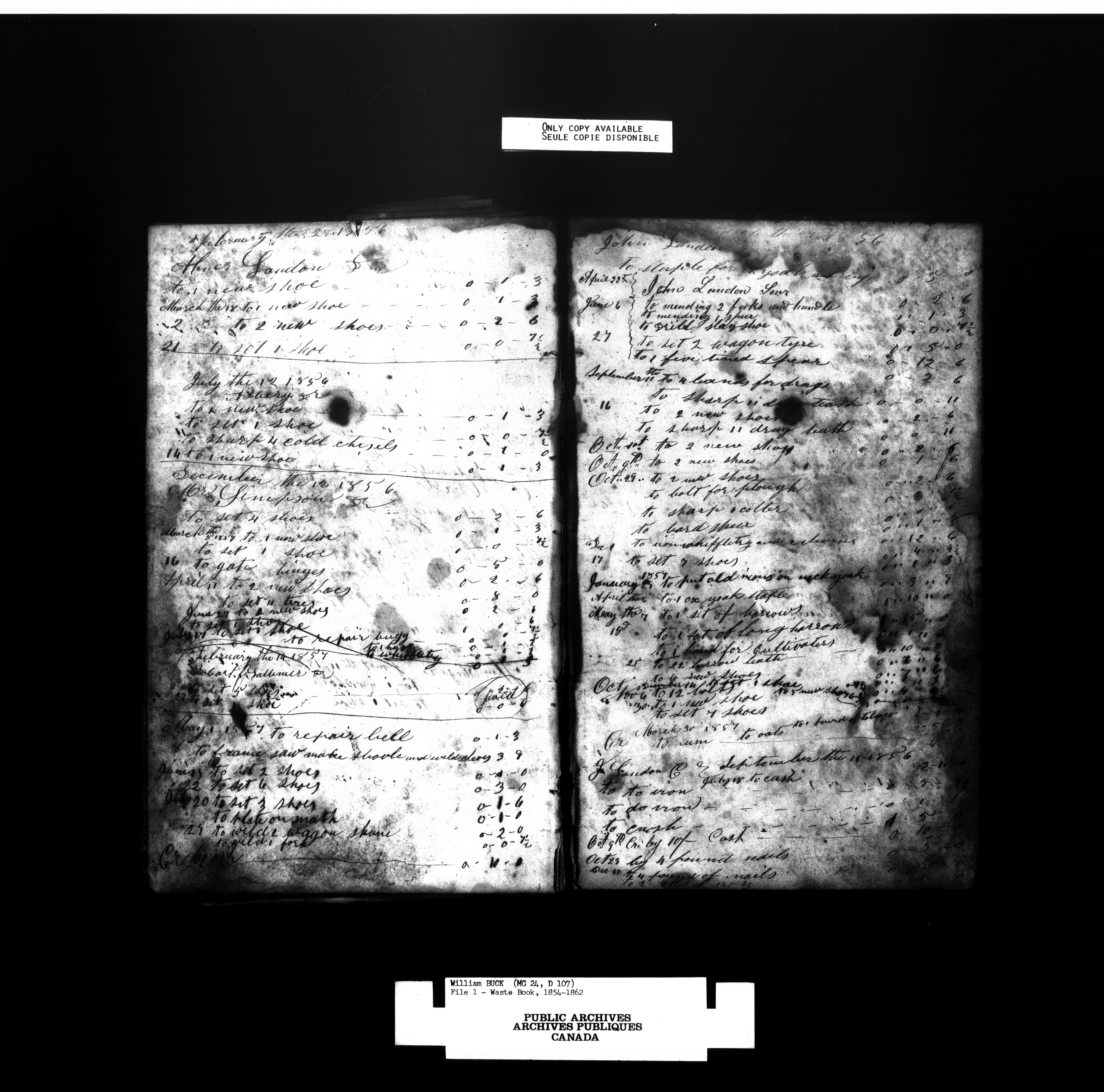 William Buck's waste books containing rough accounts of blacksmith work done, 1854-1862, 1879-1984Index to accounts and personal papers - 1563